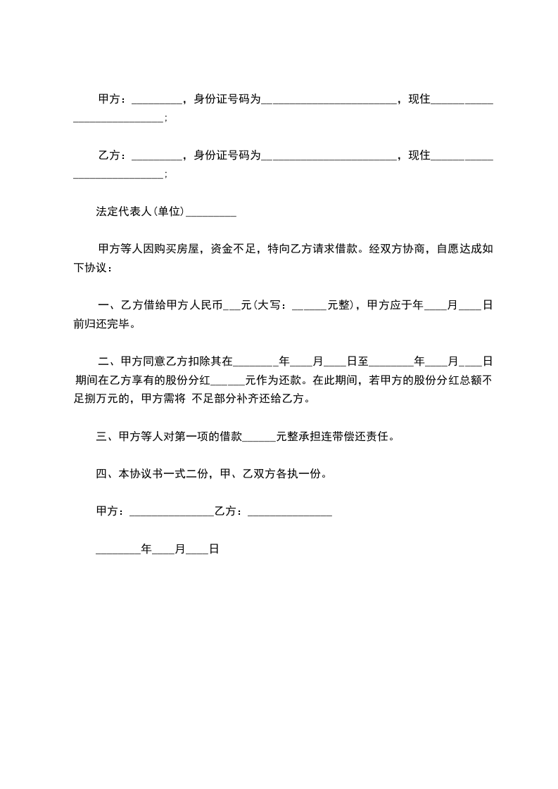 四、双方确认,如果甲方与__________________公司之间的劳动关系结束,则本合同于该结束之日同时解除,此等情况下甲方应于该解除之日起的____日内归还所有借款本息。