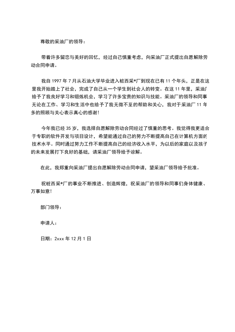 带着许多留恋与美好的回忆,经过自己慎重考虑,向采油厂正式提出自愿解除劳动合同申请。