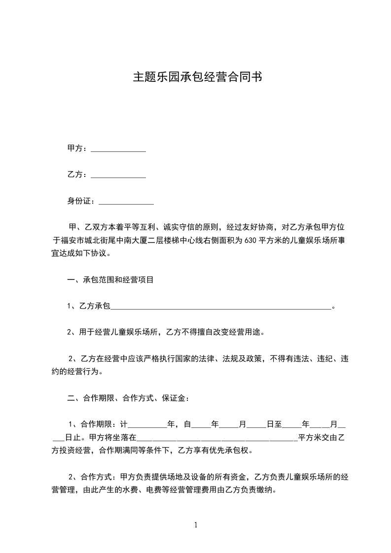 甲、乙双方本着平等互利、诚实守信的原则,经过友好协商,对乙方承包甲方位于福安市城北街尾中南大厦二层楼梯中心线右侧面积为630平方米的儿童娱乐场所事宜达成如下协议。