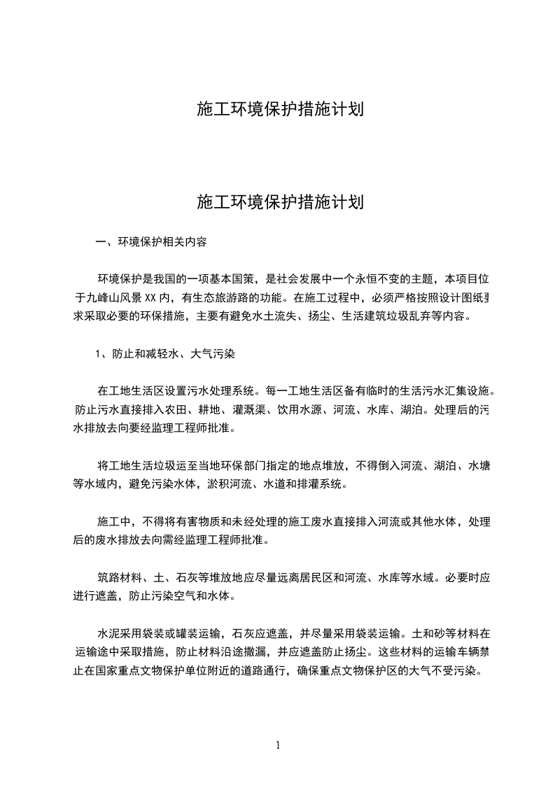 环境保护是我国的一项基本国策,是社会发展中一个永恒不变的主题,本项目位于九峰山风景XX内,有生态旅游路的功能。在施工过程中,必须严格按照设计图纸要求采取必要的环保措施,主要有避免水土流失、扬尘、生活建筑垃圾乱弃等内容。