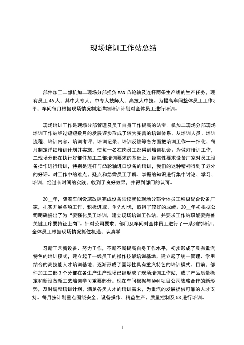 20__年,随着车间设施改建完成设备陆续就位现场分部全体员工积极配合设备厂家,扎实开展各项工作,积极进取,争先创优,取得了较好的成绩。20__年初根据公司明确提出了为“要强化员工培训,建立现场培训工作站,并要求工作站职能要完善,关键工序要持证上岗”。针对公司要求,部门及车间对全体员工进行了一系列的培训,全体员工根据现场情况抓住机遇、认真学