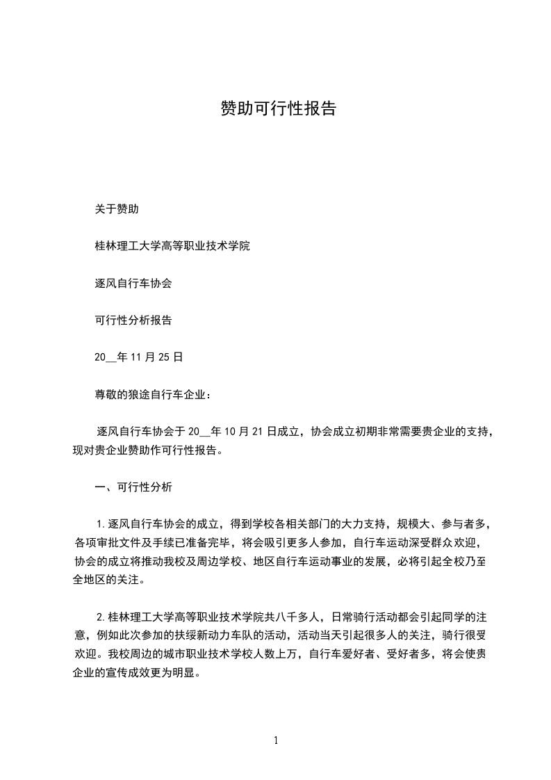 逐风自行车协会于20__年10月21日成立,协会成立初期非常需要贵企业的支持,现对贵企业赞助作可行性报告。