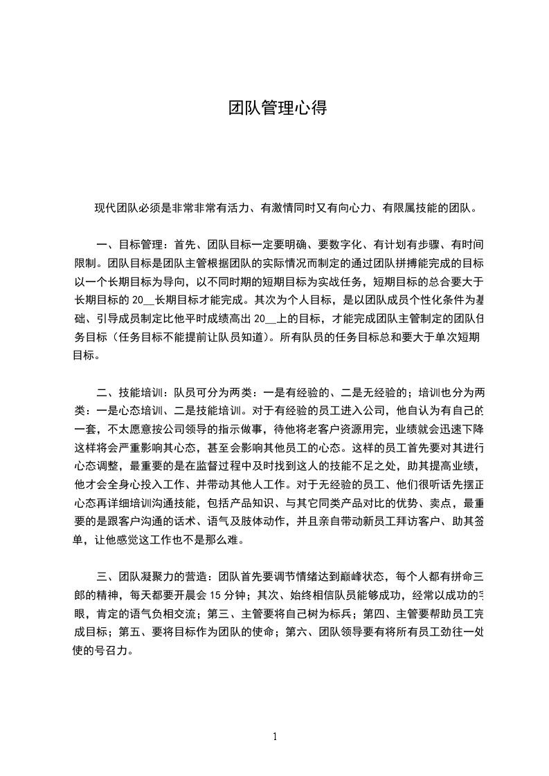 团队是指在一个组织中,依具各成员的工作能力和性格组成各个小组,参与组织团队的管理和解决问题等事务,以提高组织生产力和组织目标。团队管理的基础在于团队成员,其成员可从2至25人之间,理想上少于10人较佳。团队管理是运用成员专长,鼓励成员参与及相互合作,致力于组织发展,所以可说是合作式管理,亦是一种参与式管理。而作为一支销售团队,若想成功的将其团队做大做强,首先在于团队管理者的综合素质和管理方式的适当应用,及其对公司整体目标的把握和以及各部门的密切配合。而我认为,使用JPKZ法则,可使销售团队管理变得更加简单有效。