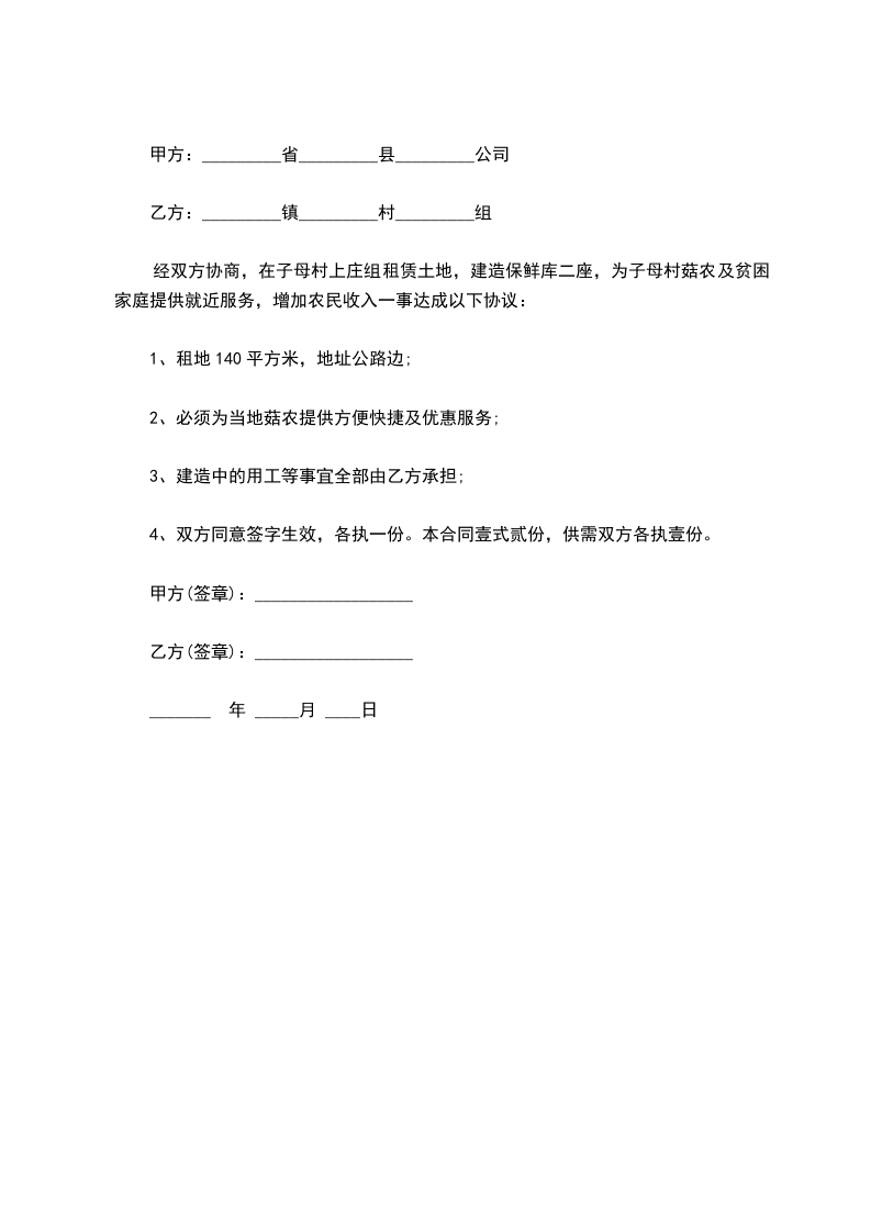 经双方协商,在子母村上庄组租赁土地,建造保鲜库二座,为子母村菇农及贫困家庭提供就近服务,增加农民收入一事达成以下协议: