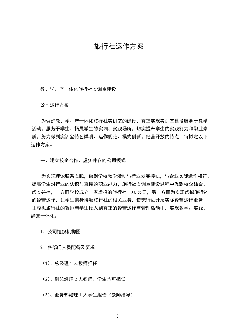 为做好教、学、产一体化旅行社实训室的建设,真正实现实训室建设服务于教学活动、服务于学生,拓展学生的实训、实践场所,切实提升学生的实践能力和职业素质,努力做到实训室特色鲜明、运作规范、模式创新、经营开放的特点,特拟定以下运作方案。