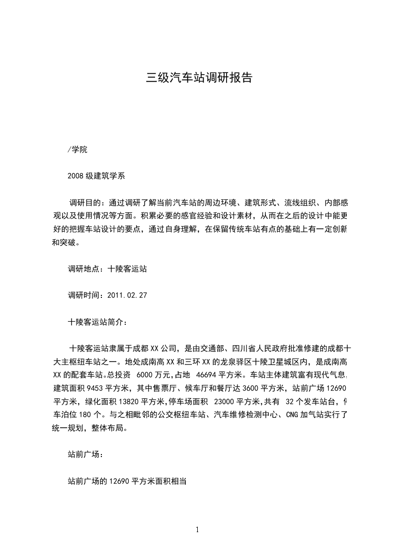 调研目的:通过调研了解当前汽车站的周边环境、建筑形式、流线组织、内部感观以及使用情况等方面。积累必要的感官经验和设计素材,从而在之后的设计中能更好的把握车站设计的要点,通过自身理解,在保留传统车站有点的基础上有一定创新和突破。