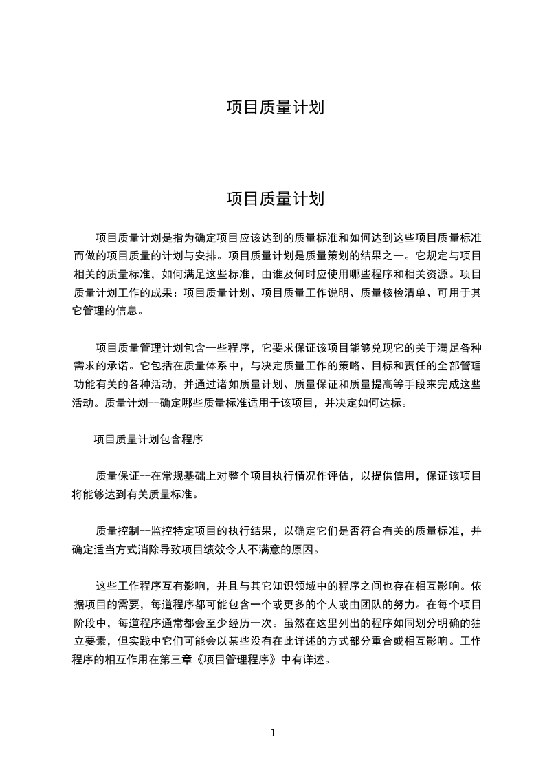 1.质量管理计划。质量管理计划应说明项目管理小组如何具体执行它的质量策略。在ISO9000的术语中,对质量体系的描述是:"组织结构、责任、工序、工作过程、及具体执行质量管理所需的资源"[5]。