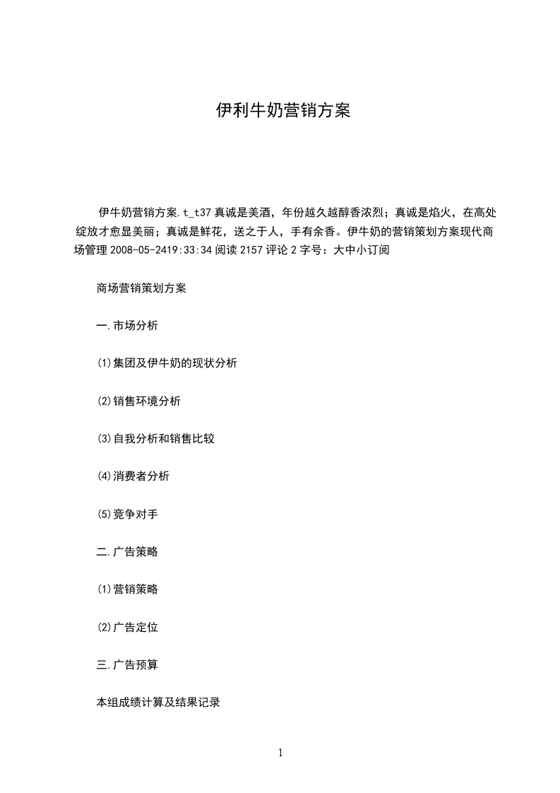 伊牛奶营销方案.t_t37真诚是美酒,年份越久越醇香浓烈;真诚是焰火,在高处绽放才愈显美丽;真诚是鲜花,送之于人,手有余香。伊牛奶的营销策划方案现代商场管理2008-05-2419:33:34阅读2157评论2字号:大中小订阅