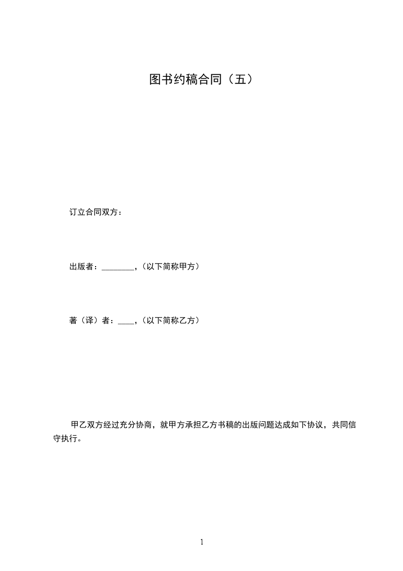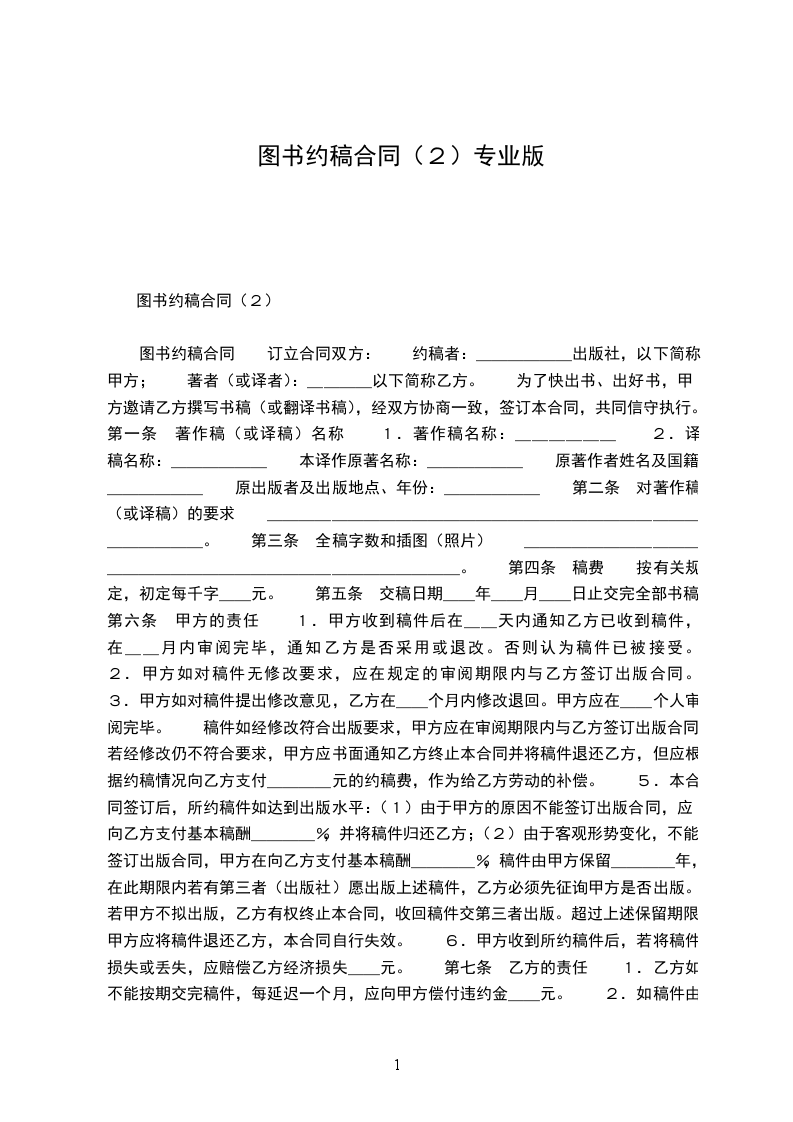 图书约稿合同 订立合同双方: 约稿者:______出版社,以下简称甲方; 著者(或译者):____以下简称乙方。 为了快出书、出好书,甲方邀请乙方撰写书稿(或翻译书稿),经双方协商一致,签订本合同,共同信守执行。 第一条 著作稿(或译稿)名称 1.著作稿名称:______ 2.译稿名称:______ 本译作原著名称:______ 原著作者姓名及国籍:______ 原出版者及出版地点、年份:______ 第二条 对著作稿(或译稿)的要求 _________________________________。 第三条 全稿字数和插图(照片) _________________________________。 第四条 稿费 按有关规定,初定每千字__元。 第五条 交稿日期__年__月__日止交完全部书稿。 第六条 甲方的责任 1.甲方收到稿件后在__天内通知乙方已收到稿件,在__月内审阅完毕,通知乙方是否采用或退改。否则认为稿件已被接受。 2.甲方如对稿件无修改要求,应在规定的审阅期限内与乙方签订出版合同。 3.甲方如对稿件提出修改意见,乙方在__个月内修改退回。甲方应在__个人审阅完毕。 稿件如经修改符合出版要求,甲方应在审阅期限内与乙方签订出版合同。若经修改仍不符合要求,甲方应书面通知乙方终止本合同并将稿件退还乙方,但应根据约稿情况向乙方支付____元的约稿费,作为给乙方劳动的补偿。 5.本合同签订后,所约稿件如达到出版水平:(1)由于甲方的原因不能签订出版合同,应向乙方支付基本稿酬____%,并将稿件归还乙方;(2)由于客观形势变化,不能签订出版合同,甲方在向乙方支付基本稿酬____%,稿件由甲方保留____年,在此期限内若有第三者(出版社)愿出版上述稿件,乙方必须先征询甲方是否出版。若甲方不拟出版,乙方有权终止本合同,收回稿件交第三者出版。超过上述保留期限,甲方应将稿件退还乙方,本合同自行失效。 6.甲方收到所约稿件后,若将稿件损失或丢失,应赔偿乙方经济损失__元。 第七条 乙方的责任 1.乙方如不能按期交完稿件,每延迟一个月,应向甲方偿付违约金__元。 2.如稿件由乙方修改,乙方不能按期交回修改稿,每延期一个月,应向甲方偿付违约金__元。 3.乙方如非因不可抗力而终止本合同,应向甲方偿付违约金__元。 4.乙方如将甲方所约稿件投寄其它出版单位或期刊,应向甲偿付违约金__元。 第八条 甲乙双方签订出版合同后,本合同即自行失效。 本合同一式两份,双方各执一份为凭。 甲方:____(盖章) 代表人:____(签字) 地址:____ 电话:____ 签字日期:____ 乙方:____(盖章) 代表人:____(签字) 地址:____ 电话:____ 签字日期:____