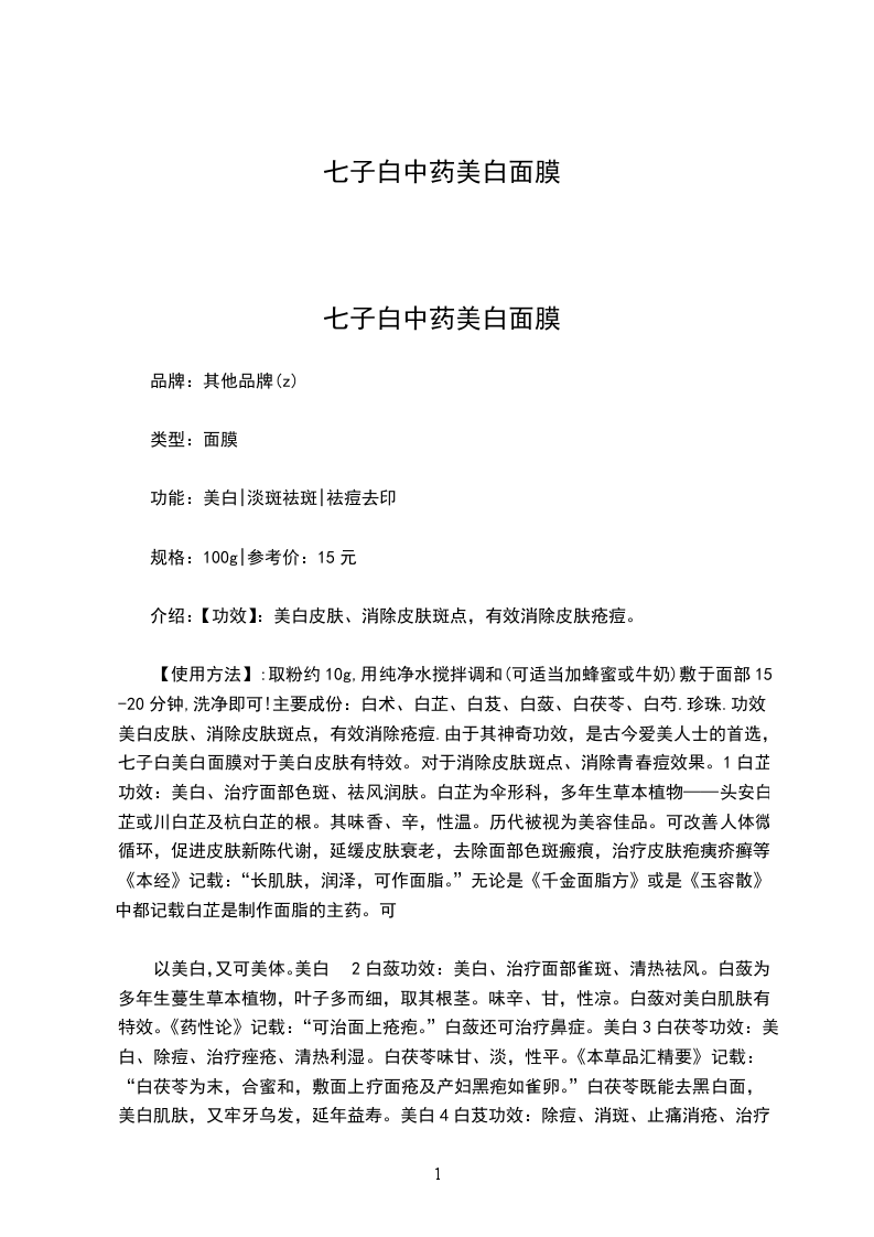 【使用方法】:取粉约10g,用纯净水搅拌调和(可适当加蜂蜜或牛奶)敷于面部15-20分钟,洗净即可!主要成份:白术、白芷、白芨、白蔹、白茯苓、白芍.珍珠.功效:美白皮肤、消除皮肤斑点,有效消除疮痘.由于其神奇功效,是古今爱美人士的首选,七子白美白面膜对于美白皮肤有特效。对于消除皮肤斑点、消除青春痘效果。1白芷功效:美白、治疗面部色斑、祛风润肤。白芷为伞形科,多年生草本植物——头安白芷或川白芷及杭白芷的根。其味香、辛,性温。历代被视为美容佳品。可改善人体微循环,促进皮肤新陈代谢,延缓皮肤衰老,去除面部色斑瘢痕,治疗皮肤疱痍疥癣等。《本经》记载:“长肌肤,润泽,可作面脂。”无论是《千金面脂方》或是《玉容散》中都记载白芷是制作面脂的主药。可