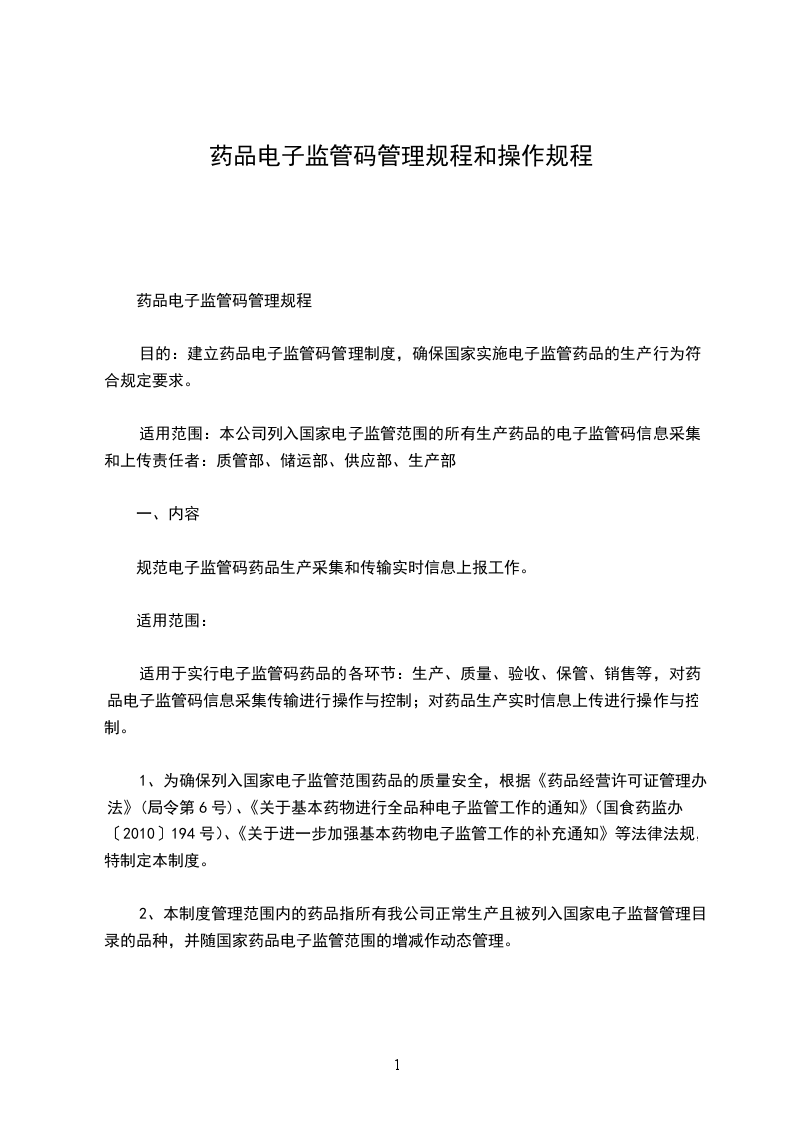 目的:建立药品电子监管码管理制度,确保国家实施电子监管药品的生产行为符合规定要求。
