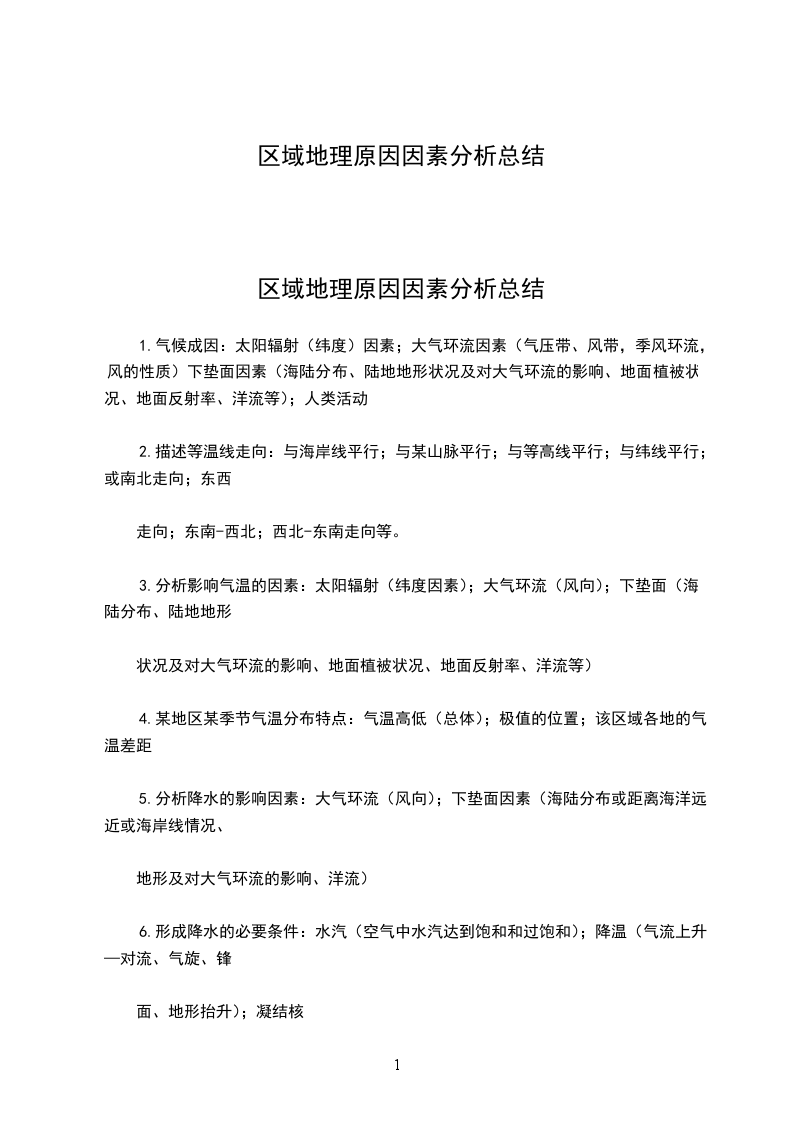1.气候成因:太阳辐射(纬度)因素;大气环流因素(气压带、风带,季风环流,风的性质)下垫面因素(海陆分布、陆地地形状况及对大气环流的影响、地面植被状况、地面反射率、洋流等);人类活动