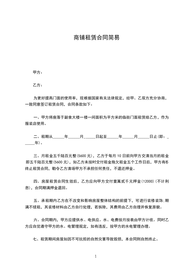 一、甲方将座落于副食大楼一楼一间面积为_____平方米的临街门面租赁给乙方,作为服装店使用。