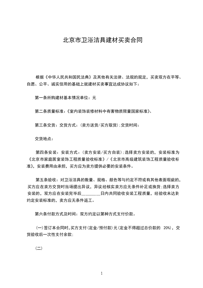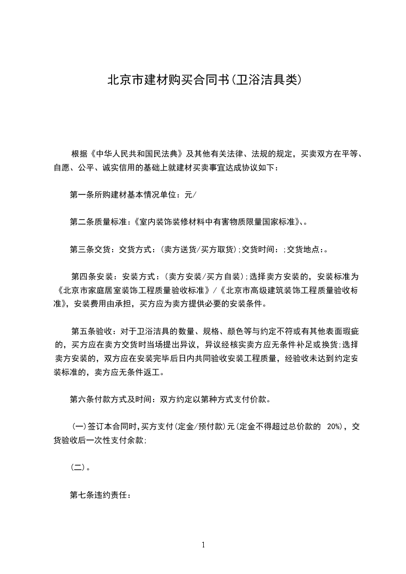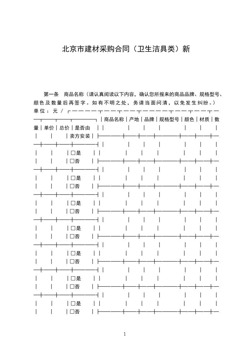 第一条 商品名称(请认真阅读以下内容,确认您所报来的商品品牌、规格型号、颜色及数量后再签字。如有不明之处,务请当面问清,以免发生纠纷。) 单位:元/┌────┬──┬──┬────┬──┬──┬──┬──┬──┬────┐│商品名称│产地│品牌│规格型号│颜色│材质│数量│单价│总价│是否由 ││ │ │ │ │ │ │ │ │ │卖方安装│├────┼──┼──┼────┼──┼──┼──┼──┼──┼────┤│ │ │ │ │ │ │ │ │ │□是 ││ │ │ │ │ │ │ │ │ │□否 │├────┼──┼──┼────┼──┼──┼──┼──┼──┼────┤│ │ │ │ │ │ │ │ │ │□是 ││ │ │ │ │ │ │ │ │ │□否 │├────┼──┼──┼────┼──┼──┼──┼──┼──┼────┤│ │ │ │ │ │ │ │ │ │□是 ││ │ │ │ │ │ │ │ │ │□否 │├────┼──┼──┼────┼──┼──┼──┼──┼──┼────┤│ │ │ │ │ │ │ │ │ │□是 ││ │ │ │ │ │ │ │ │ │□否 │├────┼──┼──┼────┼──┼──┼──┼──┼──┼────┤│ │ │ │ │ │ │ │ │ │□是 ││ │ │ │ │ │ │ │ │ │□否 │├────┼──┼──┼────┼──┼──┼──┼──┼──┼────┤│ │ │ │ │ │ │ │ │ │□是 ││ │ │ │ │ │ │ │ │ │□否 │├────┼──┼──┼────┼──┼──┼──┼──┼──┼────┤│ │ │ │ │ │ │ │ │ │□是 ││ │ │ │ │ │ │ │ │ │□否 │├────┼──┼──┼────┼──┼──┼──┼──┼──┼────┤│ │ │ │ │ │ │ │ │ │□是 ││ │ │ │ │ │ │ │ │ │□否 │├────┴──┴──┴────┴──┴──┴──┴──┴──┴────┤│合计人民币(大写) 拾 万 仟 佰 拾 元 角 分(小写): ¥ 元 │└───────────────────────────────────┘第二条 质量标准:_________。第三条 交货及安装:交货方式:(送货/送货安装/买方自提);交货时间:_________;交货地点:_________;选择送货安装方式的,买方应为卖方提供安装条件,安装标准及方式为:_________。第四条 验收及三包责任:对于卫浴洁具的规格、颜色、品牌与约定不符及有表面瑕疵的,买方应在(交货/安装)时当场提出异议,经核实卖方应无条件补足或换货;有内在质量问题的,包修期限为_________年,卖方负责免费修理;但经专业检测机构检验不符合(约定质量标准/国家标准、行业标准)的,自交货之日起两年内买方有权要求卖方无条件换、退货。第五条 付款方式及时间:双方约定以第_________种方式支付价款。(一)签订本合同时,买方支付(定金/预付款)_________元(定金不得超过总价款的20%),交货验收后一次性支付余款;(二)_________。第六条 违约责任:(一)一方迟延交货或提货的,每超过一日向对方支付迟延部分价款_________%的违约金;(二)卖方迟延交货超过_________日的,除按前款规定支付违约金外,买方还有权解除合同,卖方已收取的预付款或价款应全额返还;已支付的定金,买方在不收取违约金的情况下可要求卖方双倍返还;(三)买方无正当理由单方解除合同的,应赔偿由此给卖方造成的损失,已支付的定金无权要求返还。第七条 卖方撤离展销会或市场的,由展销会和市场主办单位先行承担赔偿责任;主办单位承担责任之后,有权向卖方追偿。第八条 争议解决方式:本合同项下发生的争议,双方应协商或向市场主办单位、消费者协会申请调解解决,也可向行政机关提出申诉;协商、调解、申诉解决不成的,应向_________人民法院提起诉讼,或按照另行达成的仲裁条款或仲裁协议申请仲裁。第九条 其他约定事项:_________。第十条 双方可以书面形式对本合同予以变更或补充,但变更或补充减轻卖方责任的,以本合同为准。买方(盖章):_________ 卖方(盖章):_________住所:_________ 住所:_________联系电话:_________ 联系电话:_________委托代理人(签字):_________ 法定代表人(签字):_________ 委托代理人(签字):__________________年____月____日 _________年____月____日 签订地点:_________ 签订地点:_________ 主办单位(盖章):_________住所:_________联系电话:_________法定代表人(签字):_________委托代理人(签字):__________________年____月____日签订地点:_________