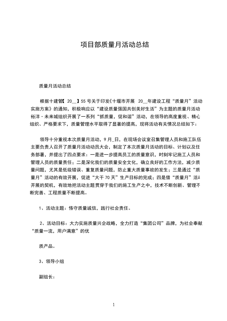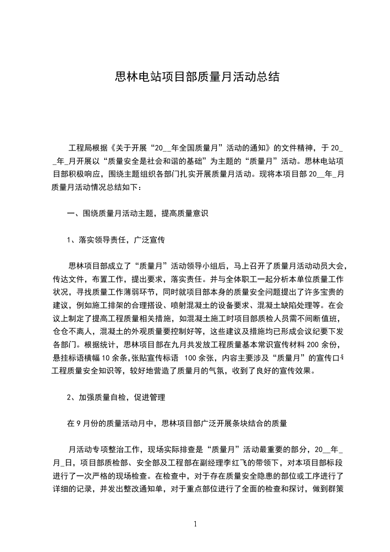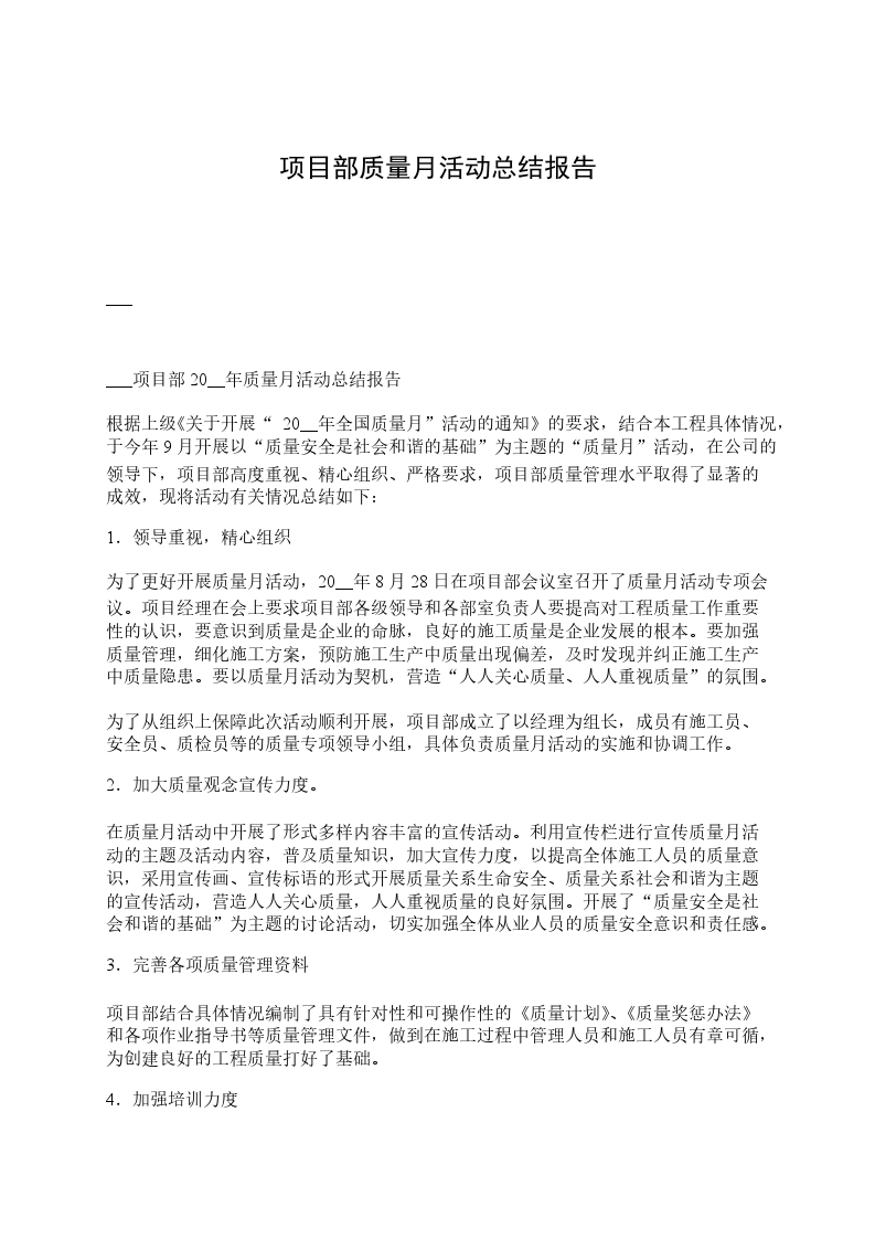 20__年_______“质量月”活动总结根据有限公司20__年度质量月活动安排的要求及公司20__年度质量管理工作规划,我项目部于9月份组织开展“质量月”活动。为切实有效的落实开展质量月活动,项目部制定了《20__年______质量月活动计划》,并于20__年9月5日在本项目部会议室召开了“质量月”活动动员会,传达公司对于质量月活动的要求和我项目部质量月活动计划,并宣讲公司质量文件、规定等。动员会上针对质量月将要进行的活动事项一一进行说明,并安排至参与个人所应该做的事项上,强调要通过质量月活动,扎实推进人员质量意识的提高,质量管理工作的持续改进。