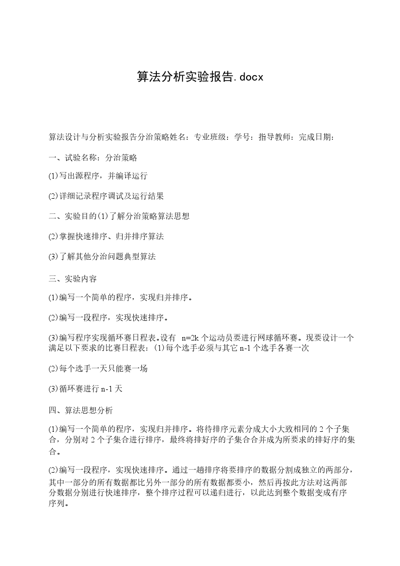 (1)学习合并排序和快速排序算法的思想,掌握原理。