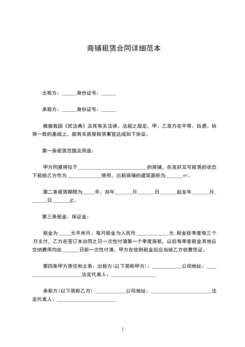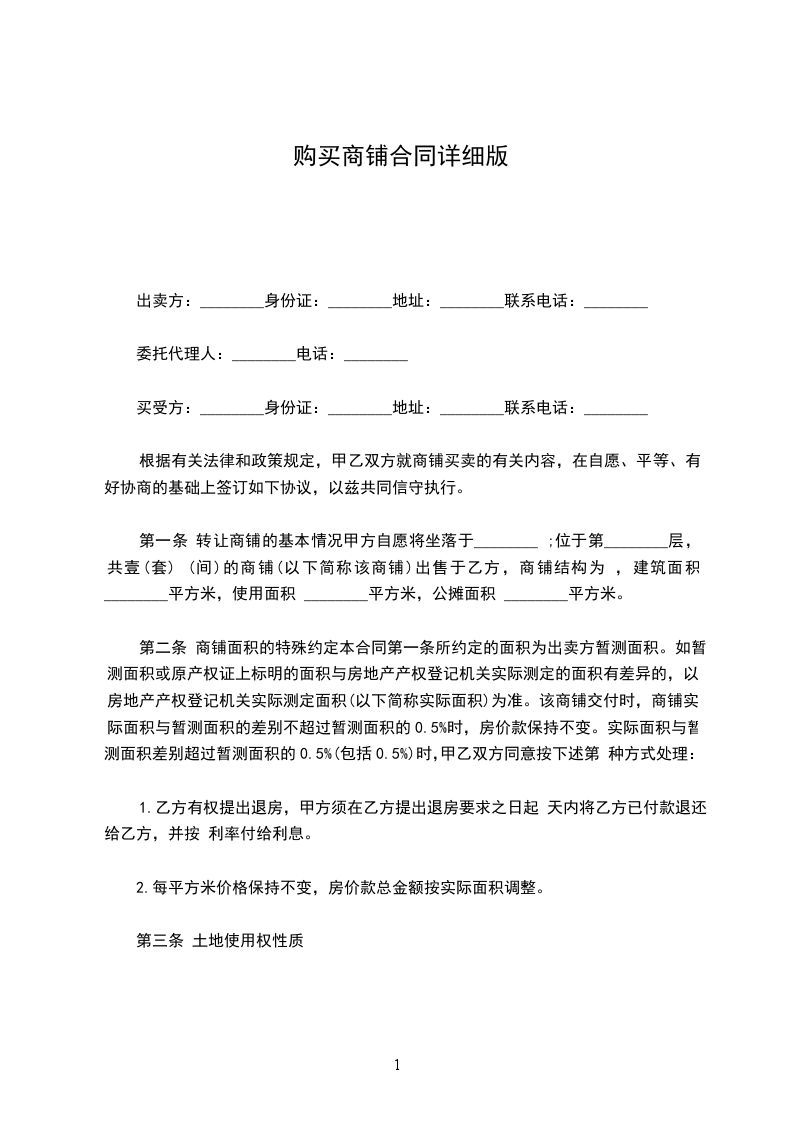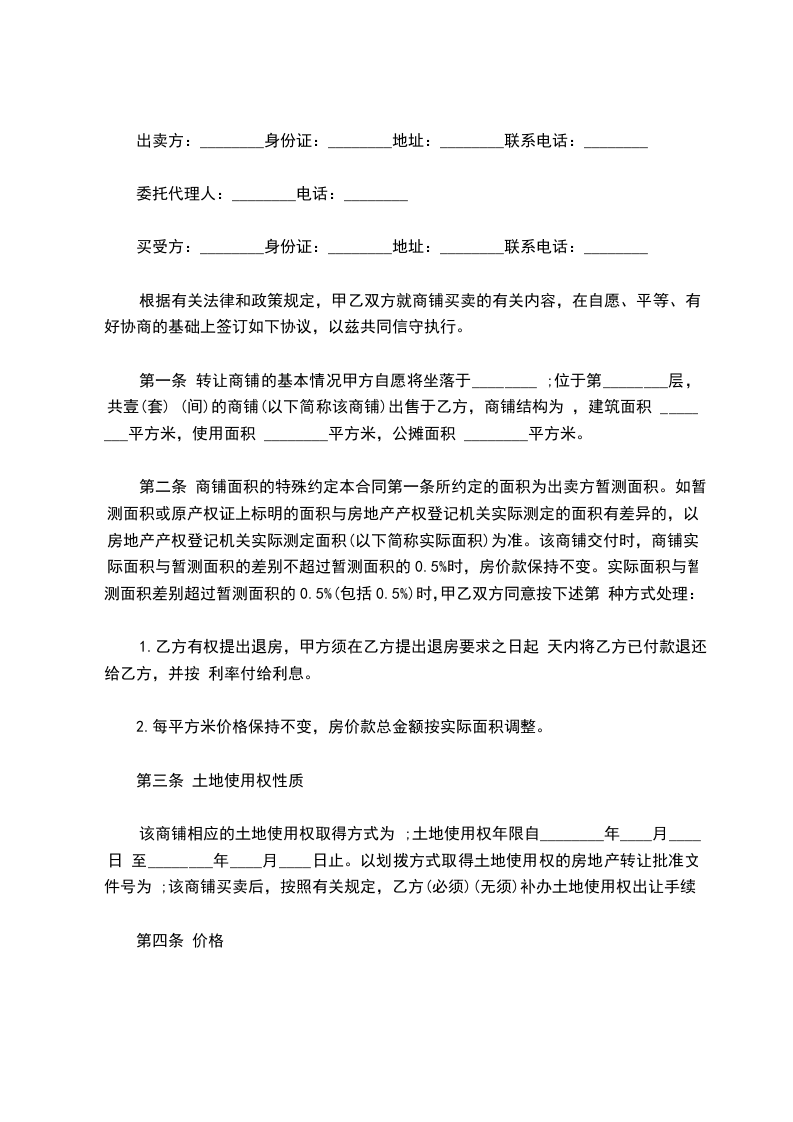 第一条 转让商铺的基本情况甲方自愿将坐落于________ ;位于第________层,共壹(套) (间)的商铺(以下简称该商铺)出售于乙方,商铺结构为 ,建筑面积 ________平方米,使用面积 ________平方米,公摊面积 ________平方米。