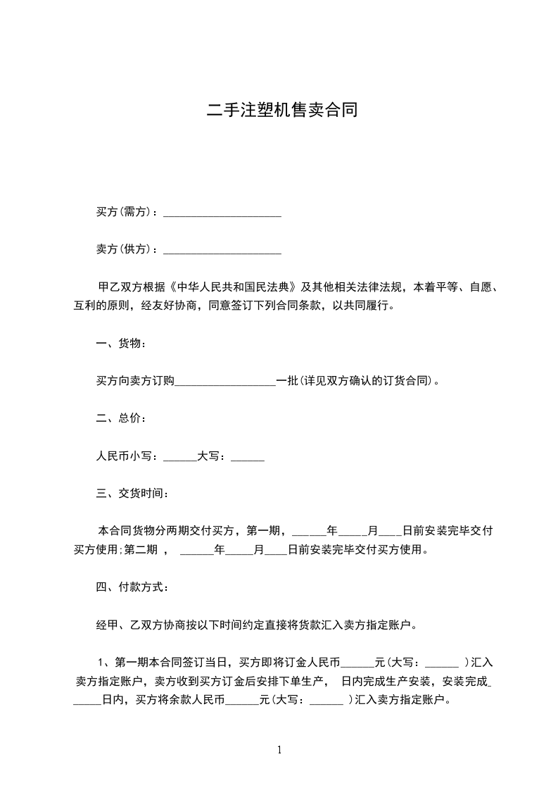 1、第一期本合同签订当日,买方即将订金人民币______元(大写:______ )汇入卖方指定账户,卖方收到买方订金后安排下单生产, 日内完成生产安装,安装完成______日内,买方将余款人民币______元(大写:______ )汇入卖方指定账户。