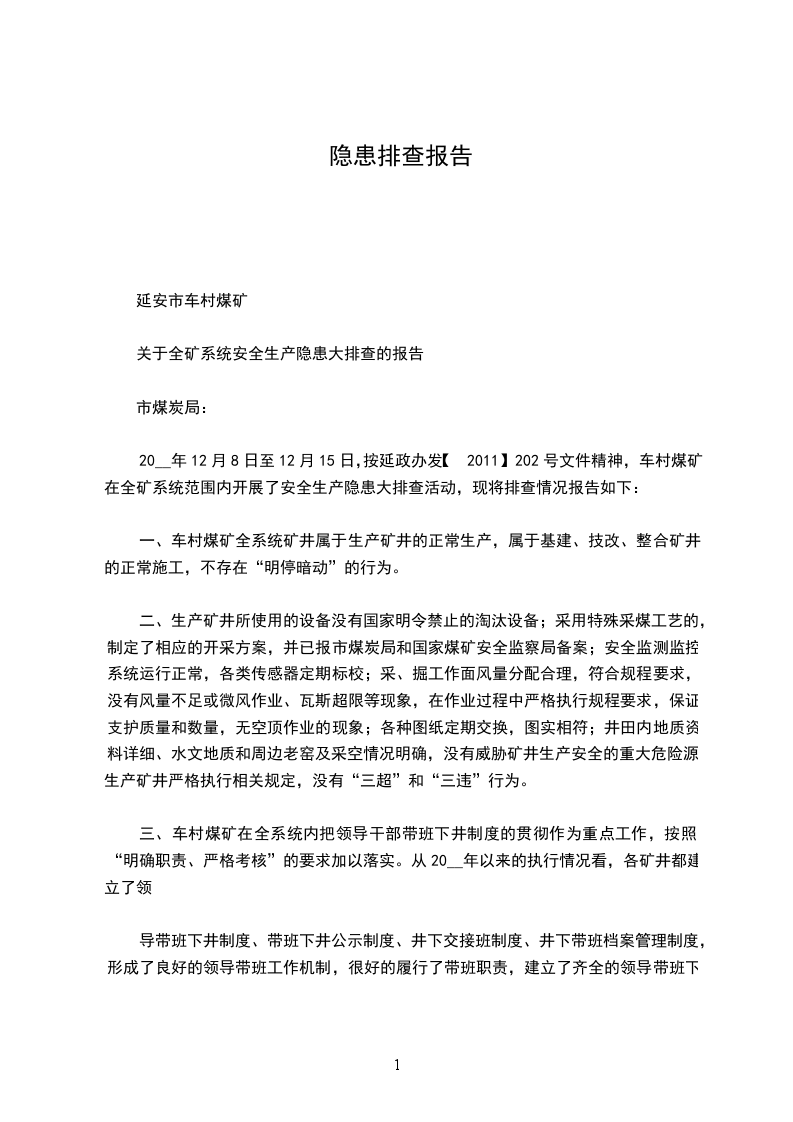 20__年12月8日至12月15日,按延政办发【2024】202号文件精神,车村煤矿在全矿系统范围内开展了安全生产隐患大排查活动,现将排查情况报告如下: