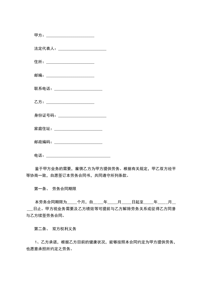 本劳务合同期限为_____个月,自_____年_____月_____日起至_____年_____月_____日止。甲方视业务需要及乙方绩效等可提前与乙方解除劳务关系或征得乙方同意与乙方续签劳务合同。
