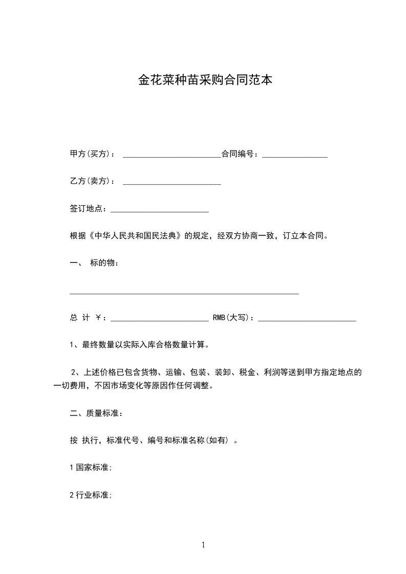 金花菜种苗采购合同范本