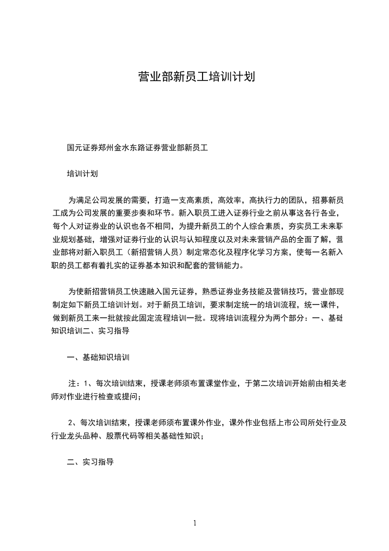 为使新招营销员工快速融入国元证券,熟悉证券业务技能及营销技巧,营业部现制定如下新员工培训计划。对于新员工培训,要求制定统一的培训流程,统一课件,做到新员工来一批就按此固定流程培训一批。现将培训流程分为两个部分:一、基础知识培训二、实习指导