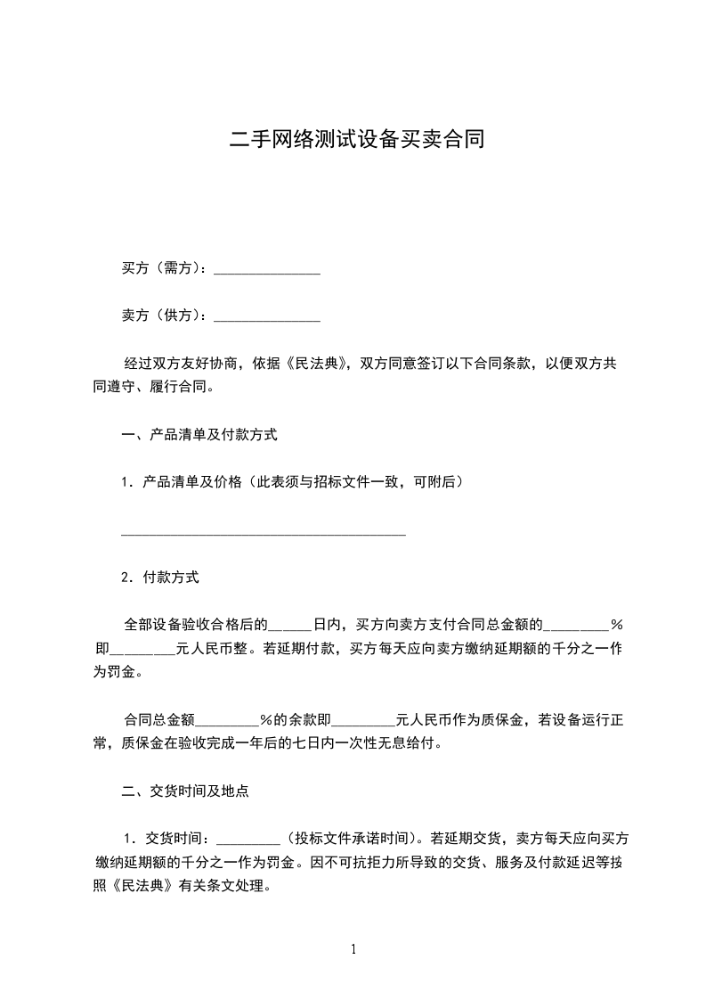 1.交货时间:_________(投标文件承诺时间)。若延期交货,卖方每天应向买方缴纳延期额的千分之一作为罚金。因不可抗拒力所导致的交货、服务及付款延迟等按照《民法典》有关条文处理。