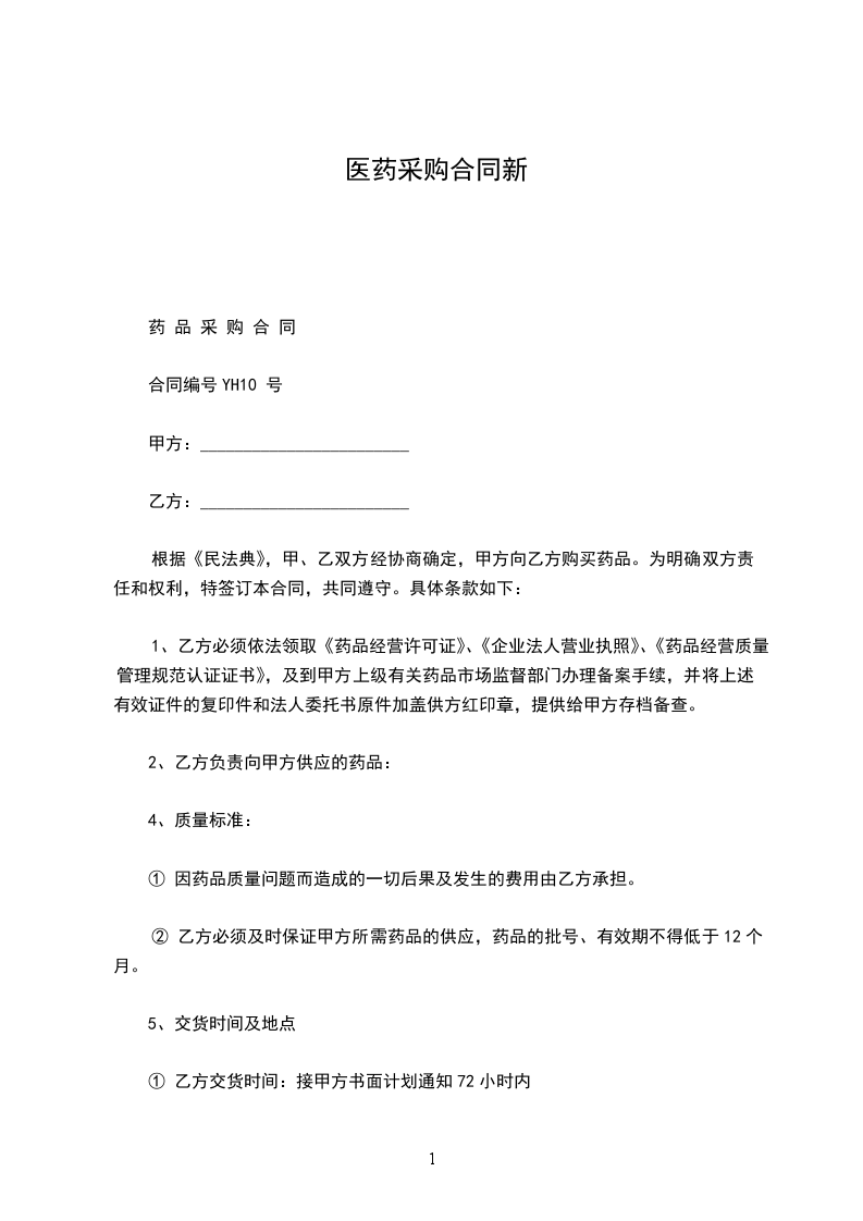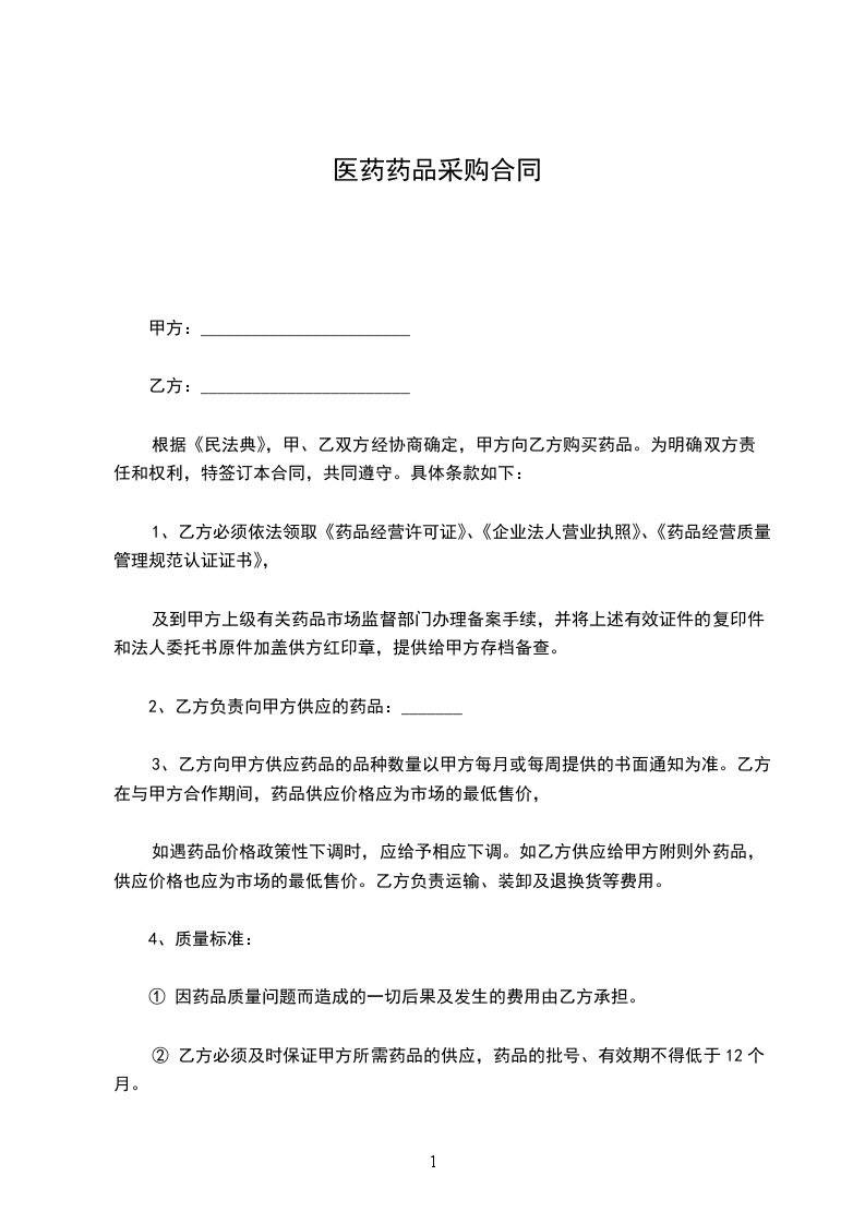 根据《民法典》,甲、乙双方经协商确定,甲方向乙方购买药品。为明确双方责任和权利,特签订本合同,共同遵守。具体条款如下: