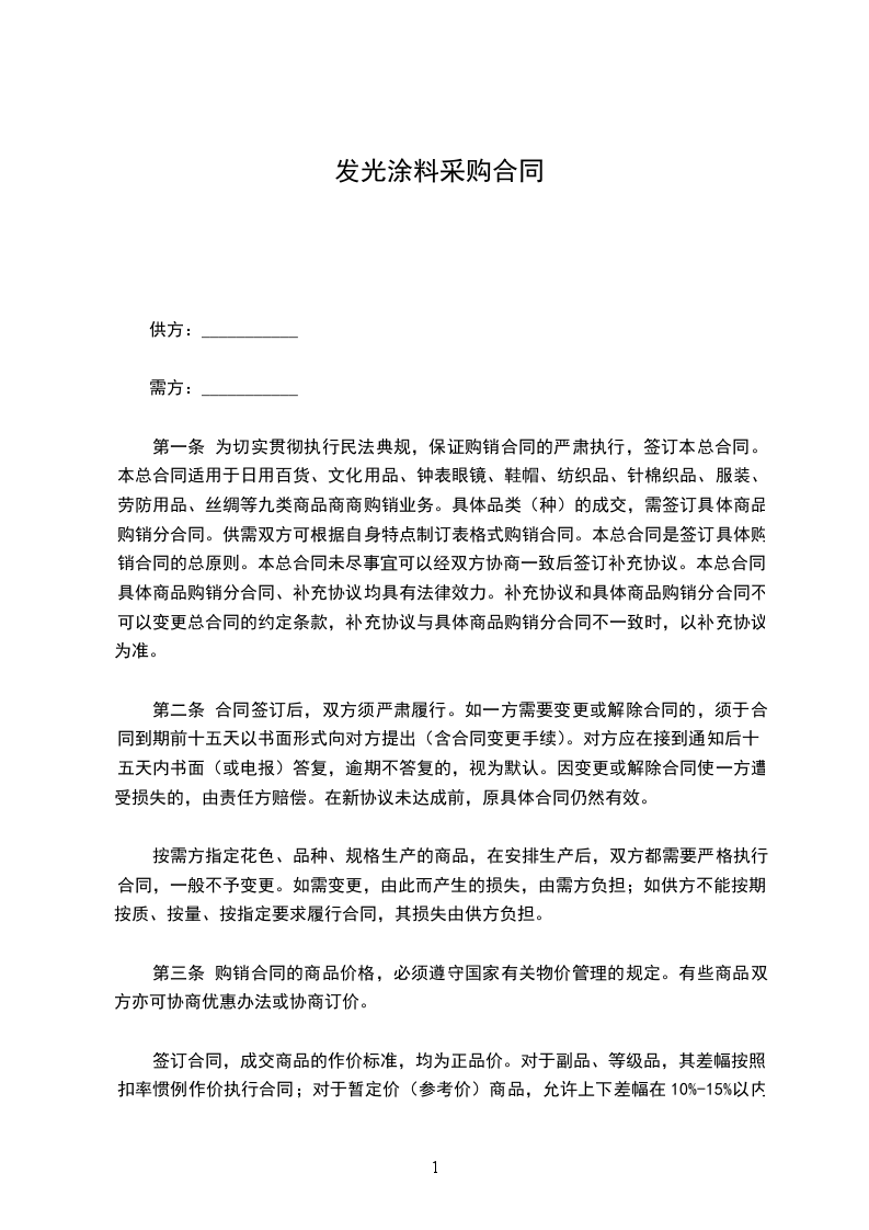 第一条 为切实贯彻执行民法典规,保证购销合同的严肃执行,签订本总合同。本总合同适用于日用百货、文化用品、钟表眼镜、鞋帽、纺织品、针棉织品、服装、劳防用品、丝绸等九类商品商商购销业务。具体品类(种)的成交,需签订具体商品购销分合同。供需双方可根据自身特点制订表格式购销合同。本总合同是签订具体购销合同的总原则。本总合同未尽事宜可以经双方协商一致后签订补充协议。本总合同、具体商品购销分合同、补充协议均具有法律效力。补充协议和具体商品购销分合同不可以变更总合同的约定条款,补充协议与具体商品购销分合同不一致时,以补充协议为准。