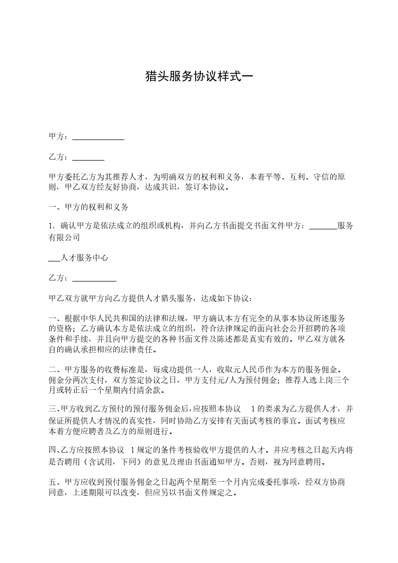 3.甲方一经决定录用乙方推荐的候选人,应向乙方提供录用确认书复印件;录用确认书应包括候选人的录用工资、上班报到日期、工作职责等;否则,乙方将不能履行保证期的约定。
