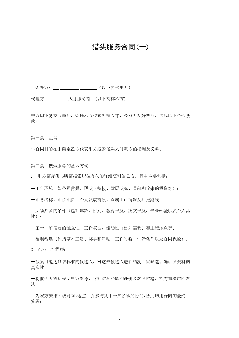 本合同目的在于确定乙方代表甲方搜索候选人时双方的权利及义务。