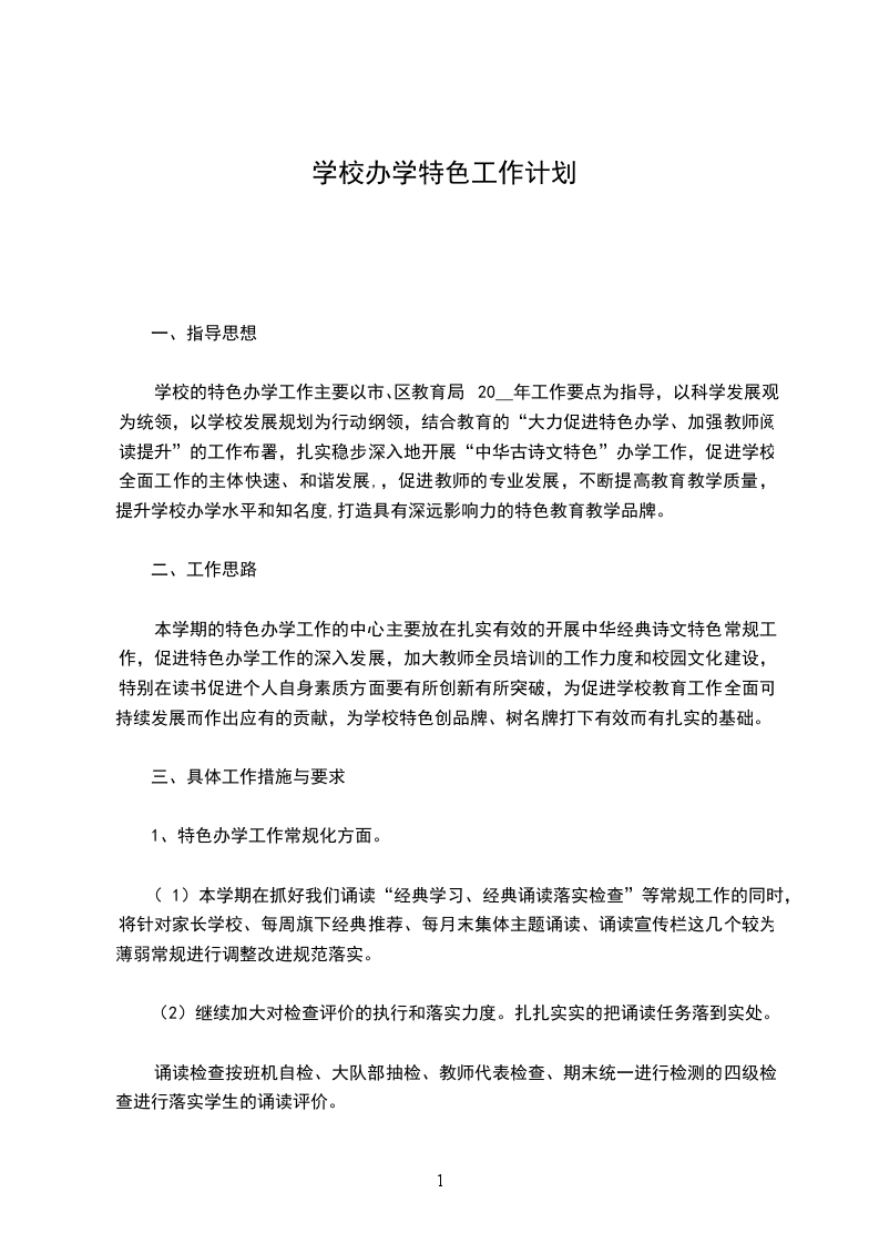 学校的特色办学工作主要以市、区教育局20__年工作要点为指导,以科学发展观为统领,以学校发展规划为行动纲领,结合教育的“大力促进特色办学、加强教师阅读提升”的工作布署,扎实稳步深入地开展“中华古诗文特色”办学工作,促进学校全面工作的主体快速、和谐发展,,促进教师的专业发展,不断提高教育教学质量,提升学校办学水平和知名度,打造具有深远影响力的特色教育教学品牌。