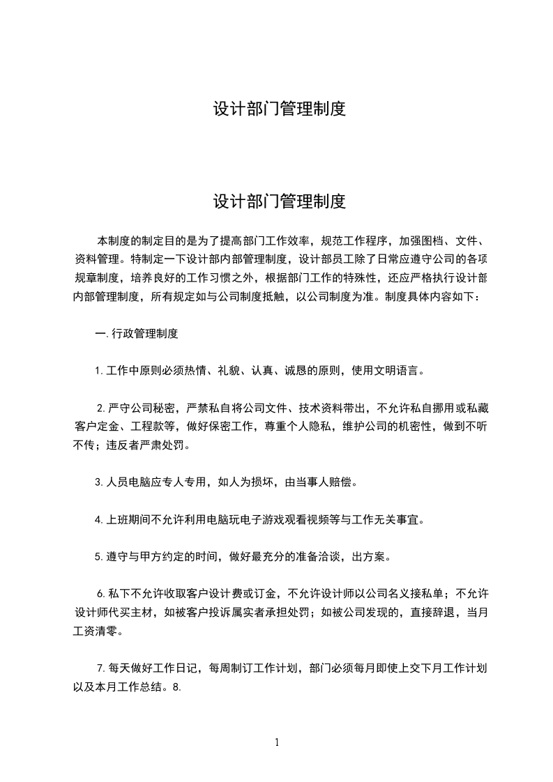 本制度的制定目的是为了提高部门工作效率,规范工作程序,加强图档、文件、资料管理。特制定一下设计部内部管理制度,设计部员工除了日常应遵守公司的各项规章制度,培养良好的工作习惯之外,根据部门工作的特殊性,还应严格执行设计部内部管理制度,所有规定如与公司制度抵触,以公司制度为准。制度具体内容如下: