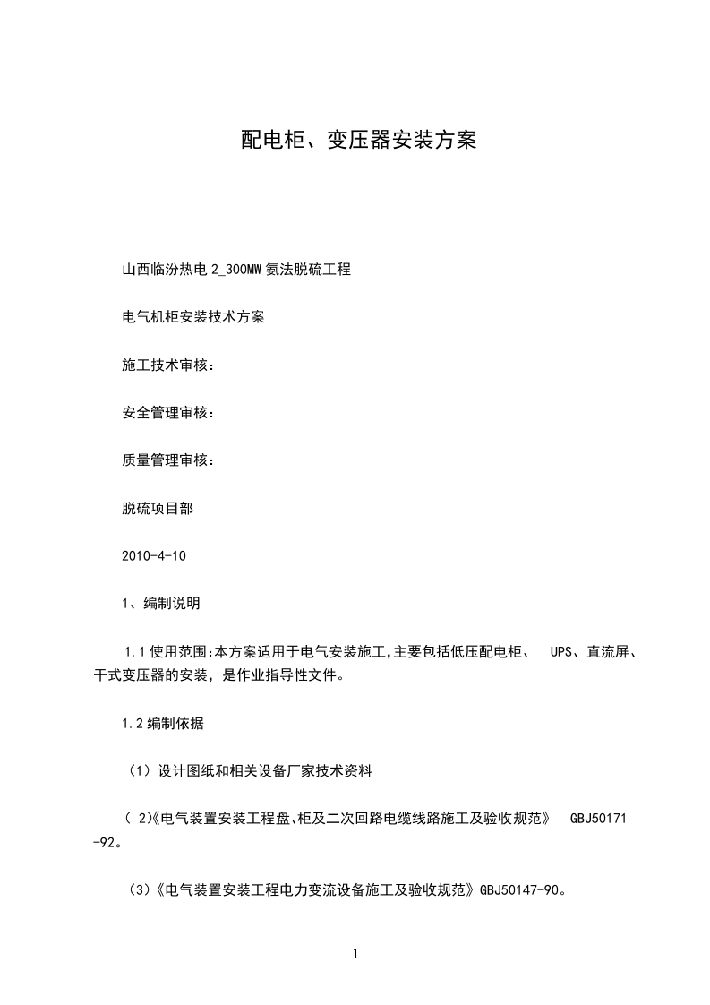 1.1使用范围:本方案适用于电气安装施工,主要包括低压配电柜、UPS、直流屏、干式变压器的安装,是作业指导性文件。