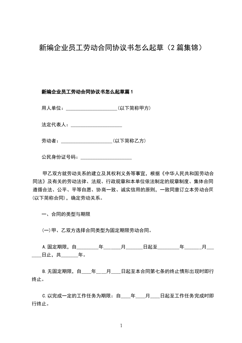 新编企业员工劳动合同协议书怎么起草篇2