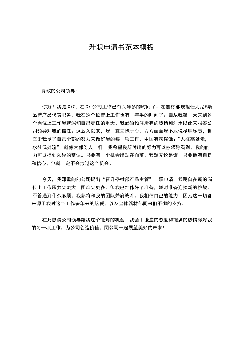 今天,我郑重的向公司提出“晋升器材部产品主管”一职申请。我明白在新的岗位上工作压力会更大,困难会更多。但我已经作好了准备,随时准备迎接新的挑战。不管遇到什么麻烦,我都将和我的团队并肩战斗。我相信自己的能力,因为这一切都来源于我对这个工作多年来的热爱,以及全体器材部同事们不懈的支持。
