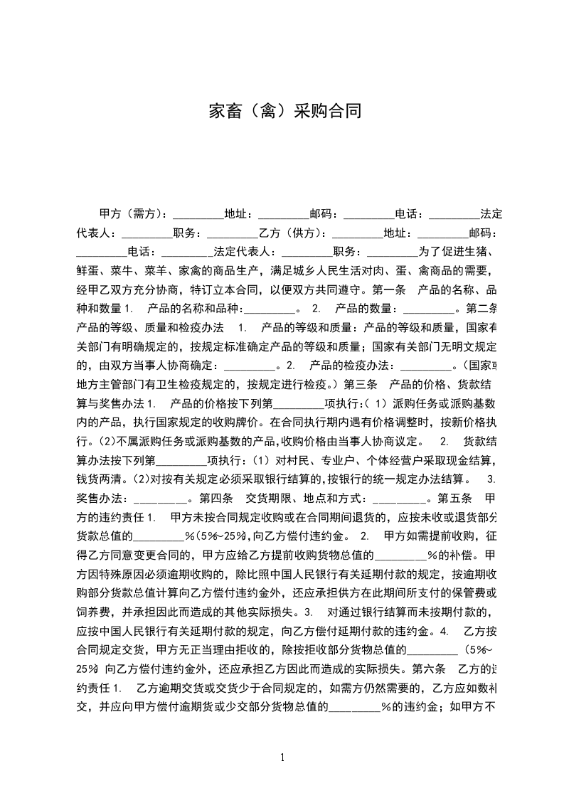 甲方(需方):_________地址:_________邮码:_________电话:_________法定代表人:_________职务:_________乙方(供方):_________地址:_________邮码:_________电话:_________法定代表人:_________职务:_________为了促进生猪、鲜蛋、菜牛、菜羊、家禽的商品生产,满足城乡人民生活对肉、蛋、禽商品的需要,经甲乙双方充分协商,特订立本合同,以便双方共同遵守。第一条 产品的名称、品种和数量1. 产品的名称和品种:_________。2. 产品的数量:_________。第二条 产品的等级、质量和检疫办法1. 产品的等级和质量:产品的等级和质量,国家有关部门有明确规定的,按规定标准确定产品的等级和质量;国家有关部门无明文规定的,由双方当事人协商确定:_________。2. 产品的检疫办法:_________。(国家或地方主管部门有卫生检疫规定的,按规定进行检疫。)第三条 产品的价格、货款结算与奖售办法1. 产品的价格按下列第_________项执行:(1)派购任务或派购基数内的产品,执行国家规定的收购牌价。在合同执行期内遇有价格调整时,按新价格执行。(2)不属派购任务或派购基数的产品,收购价格由当事人协商议定。2. 货款结算办法按下列第_________项执行:(1)对村民、专业户、个体经营户采取现金结算,钱货两清。(2)对按有关规定必须采取银行结算的,按银行的统一规定办法结算。3. 奖售办法:_________。第四条 交货期限、地点和方式:_________。第五条 甲方的违约责任1. 甲方未按合同规定收购或在合同期间退货的,应按未收或退货部分货款总值的_________%(5%~25%),向乙方偿付违约金。2. 甲方如需提前收购,征得乙方同意变更合同的,甲方应给乙方提前收购货物总值的_________%的补偿。甲方因特殊原因必须逾期收购的,除比照中国人民银行有关延期付款的规定,按逾期收购部分货款总值计算向乙方偿付违约金外,还应承担供方在此期间所支付的保管费或饲养费,并承担因此而造成的其他实际损失。3. 对通过银行结算而未按期付款的,应按中国人民银行有关延期付款的规定,向乙方偿付延期付款的违约金。4. 乙方按合同规定交货,甲方无正当理由拒收的,除按拒收部分货物总值的_________(5%~25%)向乙方偿付违约金外,还应承担乙方因此而造成的实际损失。第六条 乙方的违约责任1. 乙方逾期交货或交货少于合同规定的,如需方仍然需要的,乙方应如数补交,并应向甲方偿付逾期货或少交部分货物总值的_________%的违约金;如甲方不需要的,乙方应按逾期或分交部分货款总值的_________%(1%~20%)的违约金。2. 乙方交货时间比合同规定提前,经有关部门证明理由正当的,甲方可考虑同意接收,并按合同规定付款;乙方无正当理由提前交货的,甲方有权拒收。3. 乙方交售的产品规格、卫生质量标准与合同规定不符时,甲方可以拒收。乙方如经有关部门证明确有正当理由,甲方仍然需要乙方交货的,乙方可以迟延交货,不按违约处理。第七条 不可抗力合同执行期内,如发生自然灾害或其他不可抗力的原因,致使当事人一方不能履行、不能完全履行或不能适当履行合同的,应向对方当事人通报理由,经有关主管部门证实后,不负违约责任,并允许变更或解除合同。第八条 其他约定:_________。当事人一方要求变更或解除合同,应提前通知对方,并采用书面形式由当事人双方达成协议。接到要求变更或解除合同通知的一方,应在7天之内作出答复,逾期不答复的,视为默认。违约金、赔偿金应在有关部门确定责任后10天内(当事人有约定的,从约定)偿付,否则按逾期付款处理。任何一方不得自行用扣付货款来抵充。第九条 本合同正本一式二份,甲乙双方各执一份(两份具有同等效力)。第十条 本合同于_________年_________月_________日在_________签订;有效期限至_________年_________月_________日。甲方(盖章):_________ 乙方(盖章):_________ 代表人(签字):_________ 代表人(签字):_________ _________年____月____日 _________年____月____日