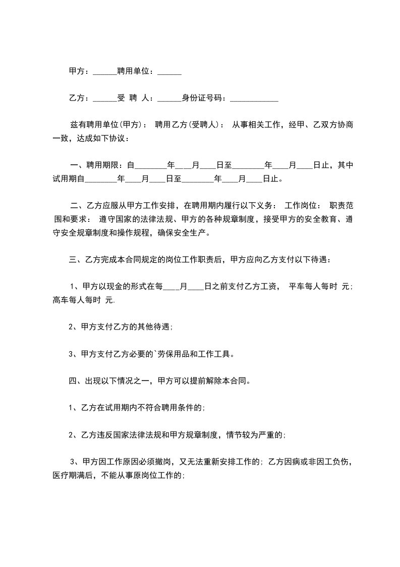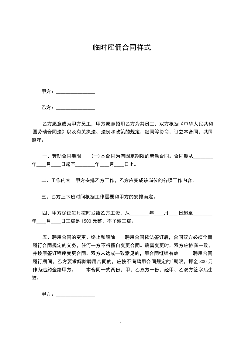 五、聘用合同的变更、终止和解除 聘用合同依法签订后,合同双方必须全面履行合同规定的义务,任何一方不得擅自变更合同。确需变更时,双方应协商一致,并按原签订程序变更合同。双方未达成一致意见的,原合同继续有效。 聘用合同履行期间,乙方要求解除聘用合同的,应按不满聘用合同规定的`期限,押金300元作为违约金给甲方。 本合同一式两份,甲、乙双方一份,经甲、乙双方签字后生效。