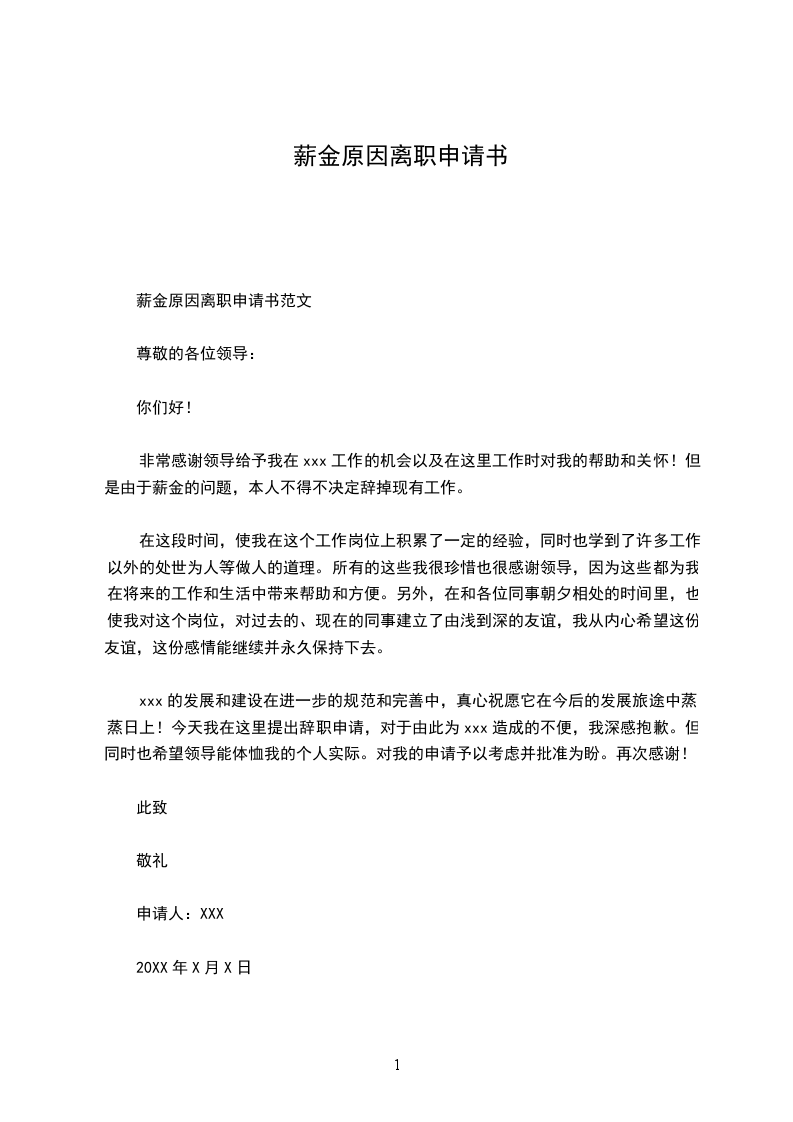 非常感谢领导给予我在xxx工作的机会以及在这里工作时对我的帮助和关怀!但是由于薪金的问题,本人不得不决定辞掉现有工作。