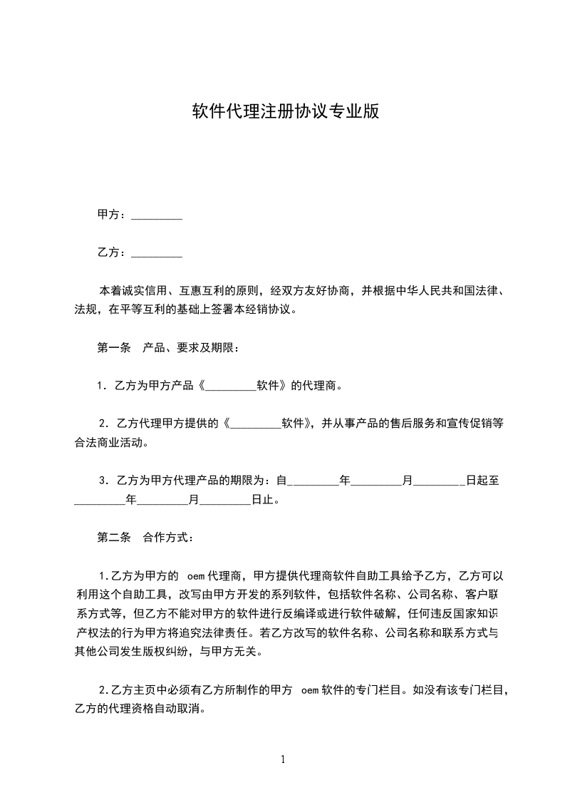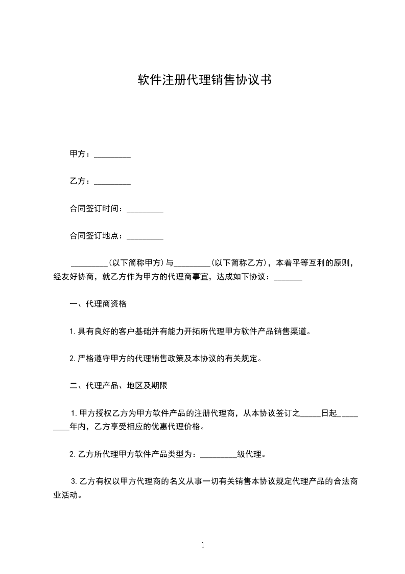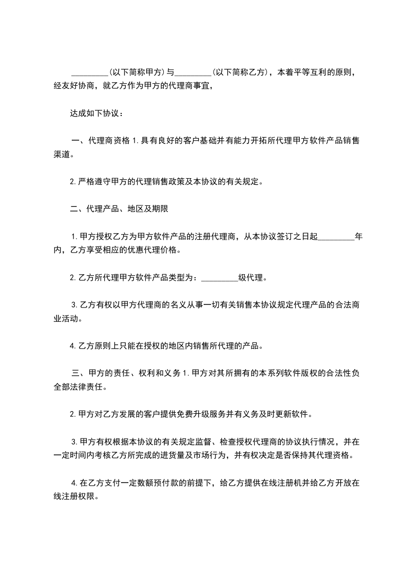 1.乙方为甲方产品《_________软件》的代理商。