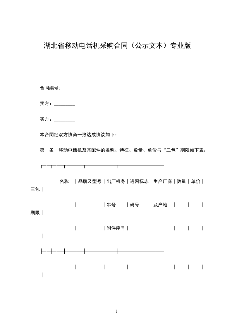 第一条 移动电话机及其配件的名称、特征、数量、单价与“三包”期限如下表: