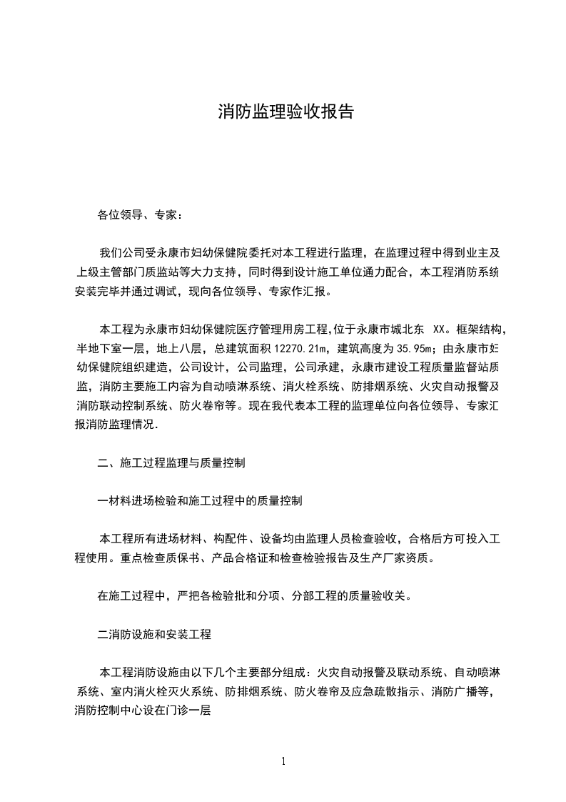 本工程为永康市妇幼保健院医疗管理用房工程,位于永康市城北东XX。框架结构,半地下室一层,地上八层,总建筑面积12270.21m,建筑高度为35.95m;由永康市妇幼保健院组织建造,公司设计,公司监理,公司承建,永康市建设工程质量监督站质监,消防主要施工内容为自动喷淋系统、消火栓系统、防排烟系统、火灾自动报警及消防联动控制系统、防火卷帘等。现在我代表本工程的监理单位向各位领导、专家汇报消防监理情况.