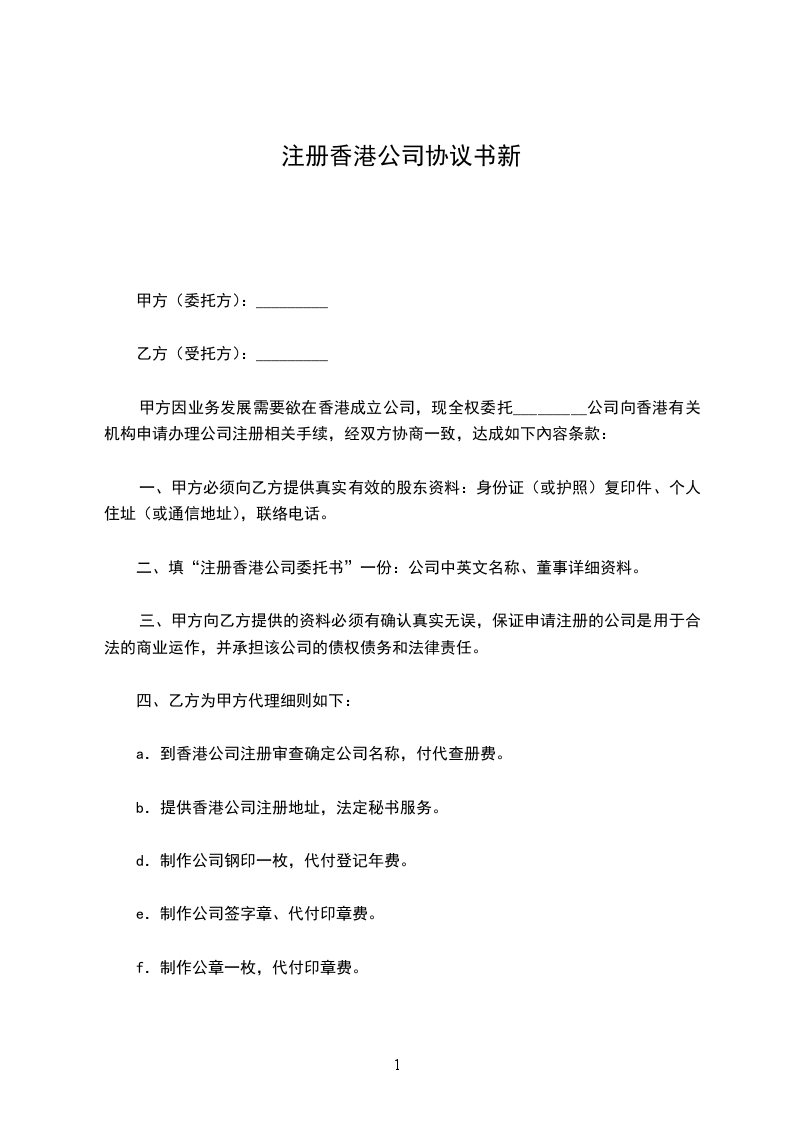 甲方因业务发展需要欲在香港成立公司,现全权委托_________公司向香港有关机构申请办理公司注册相关手续,经双方协商一致,达成如下內容条款: