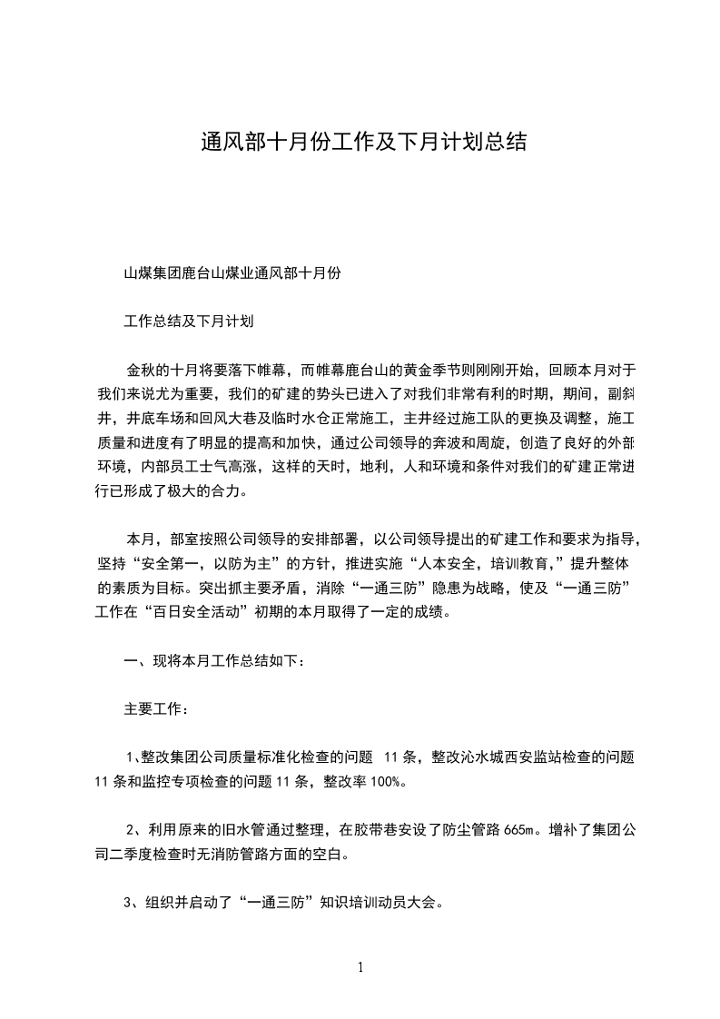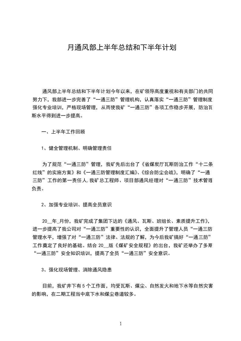 通风部上半年总结和下半年计划今年以来,在矿领导高度重视和有关部门的共同努力下,我部进一步完善了“一通三防”管理机构,认真落实“一通三防”管理制度,强化专业培训,严格现场管理,从而使我矿“一通三防”各项工作稳步开展,防治瓦斯水平得到进一步提高。