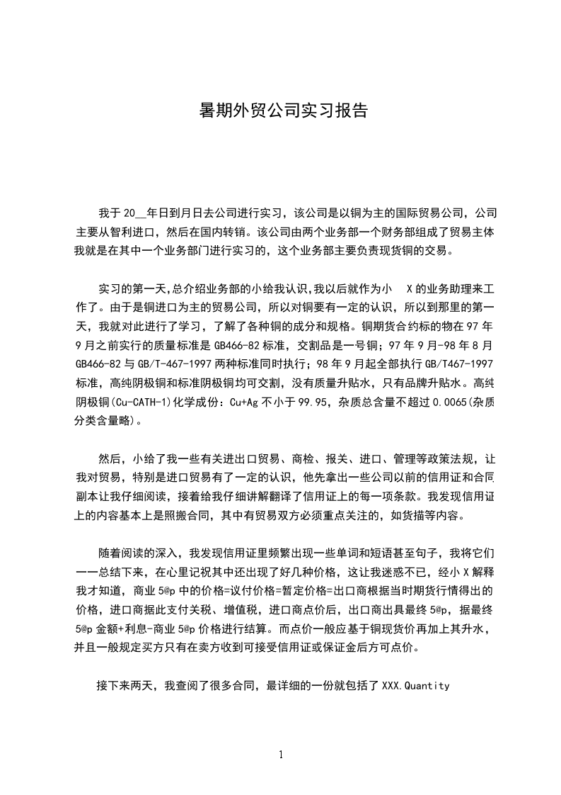 我于20__年日到月日去公司进行实习,该公司是以铜为主的国际贸易公司,公司主要从智利进口,然后在国内转销。该公司由两个业务部一个财务部组成了贸易主体,我就是在其中一个业务部门进行实习的,这个业务部主要负责现货铜的交易。