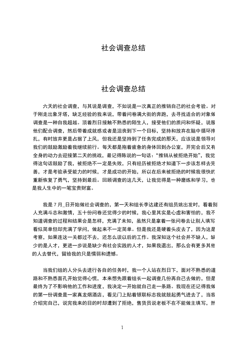 我是7月_日开始做社会调查的,第一天和组长李达建还有组员姚出发时,看着别人充满斗志和激情,五十份问卷还觉得少的时候,我心里其实是心虚和害怕的,我不知道调查的过程和结果会是怎样,充满了未知,虽然只是拿着一张问卷去让别人填写,看似简单但却充满了学问,做起来不一定简单。但是我还是硬着头皮去了,因为这是考察,如果连这一关都过不去,还怎么谈以后的工作。我深知这个社会并不缺人,缺少的是人才,更进一步说是缺少有社会实践的人才,如果我退出,那么会有更多其他的人去替代,留给我的只是懦弱和遗憾。