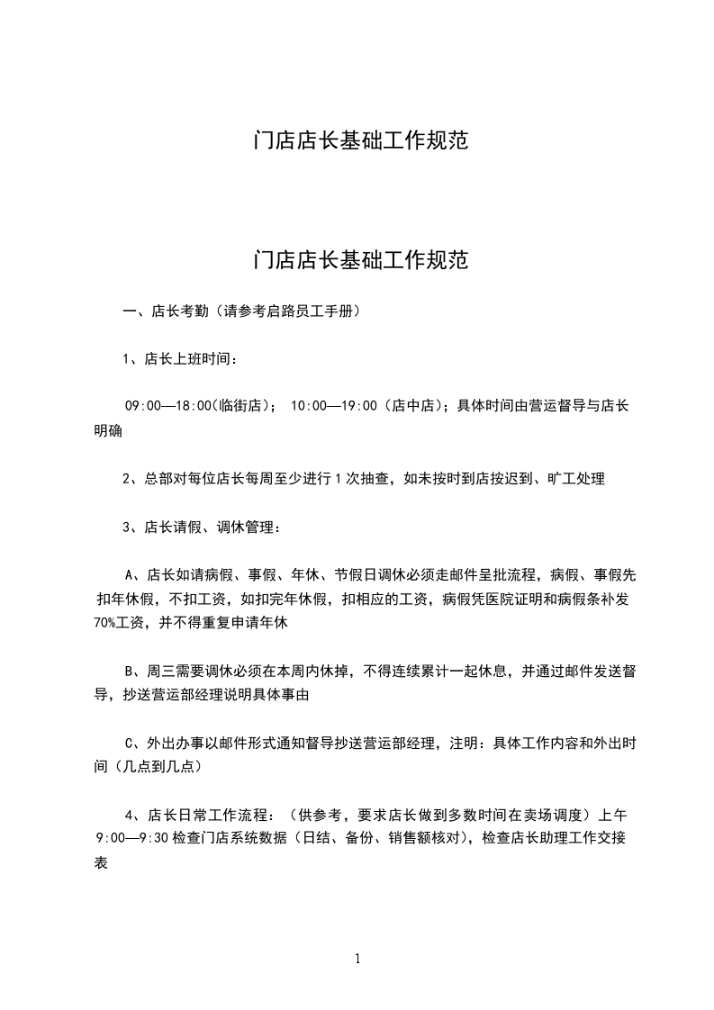 4、店长日常工作流程:(供参考,要求店长做到多数时间在卖场调度)上午9:00—9:30检查门店系统数据(日结、备份、销售额核对),检查店长助理工作交接表