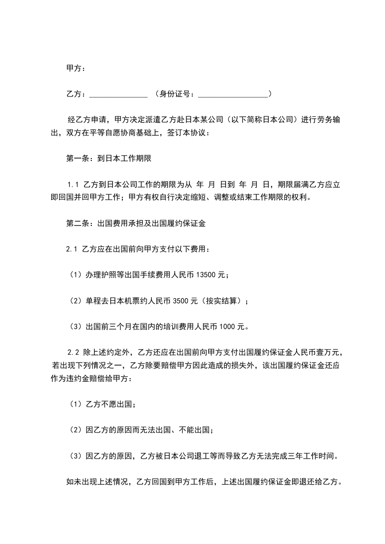 经乙方申请,甲方决定派遣乙方赴日本某公司(以下简称日本公司)进行劳务输出,双方在平等自愿协商基础上,签订本协议: