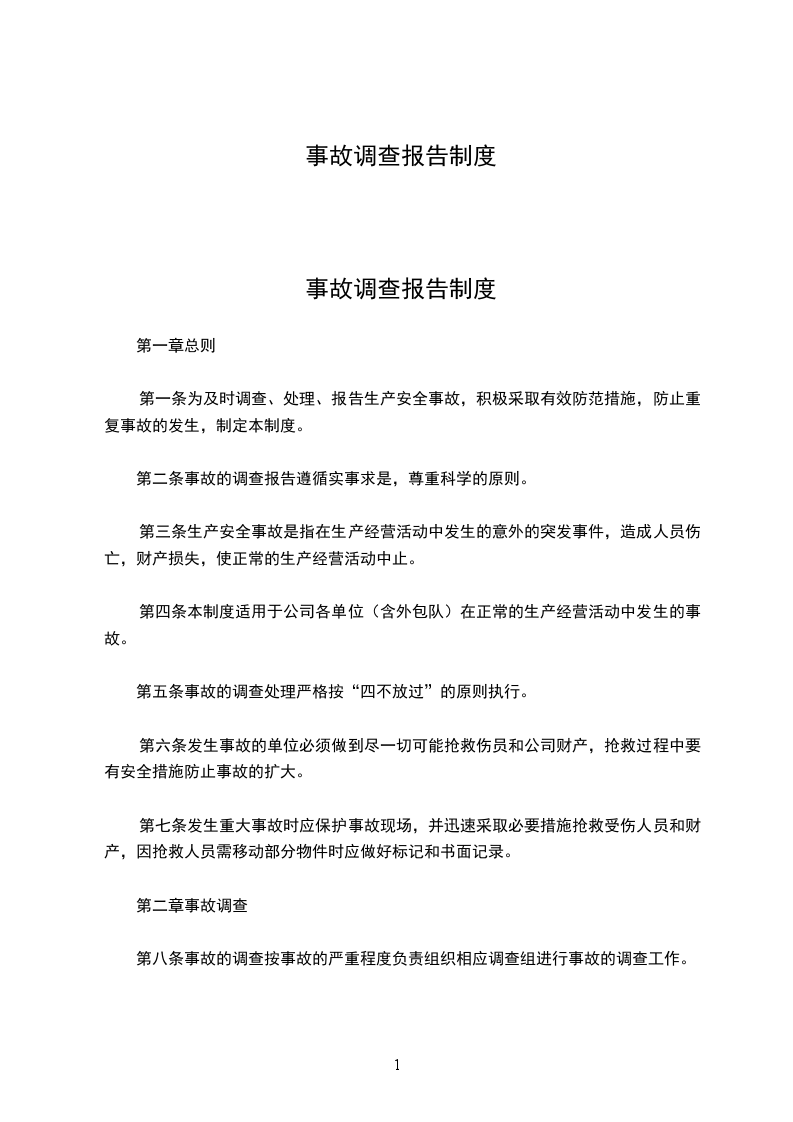第一条为及时调查、处理、报告生产安全事故,积极采取有效防范措施,防止重复事故的发生,制定本制度。