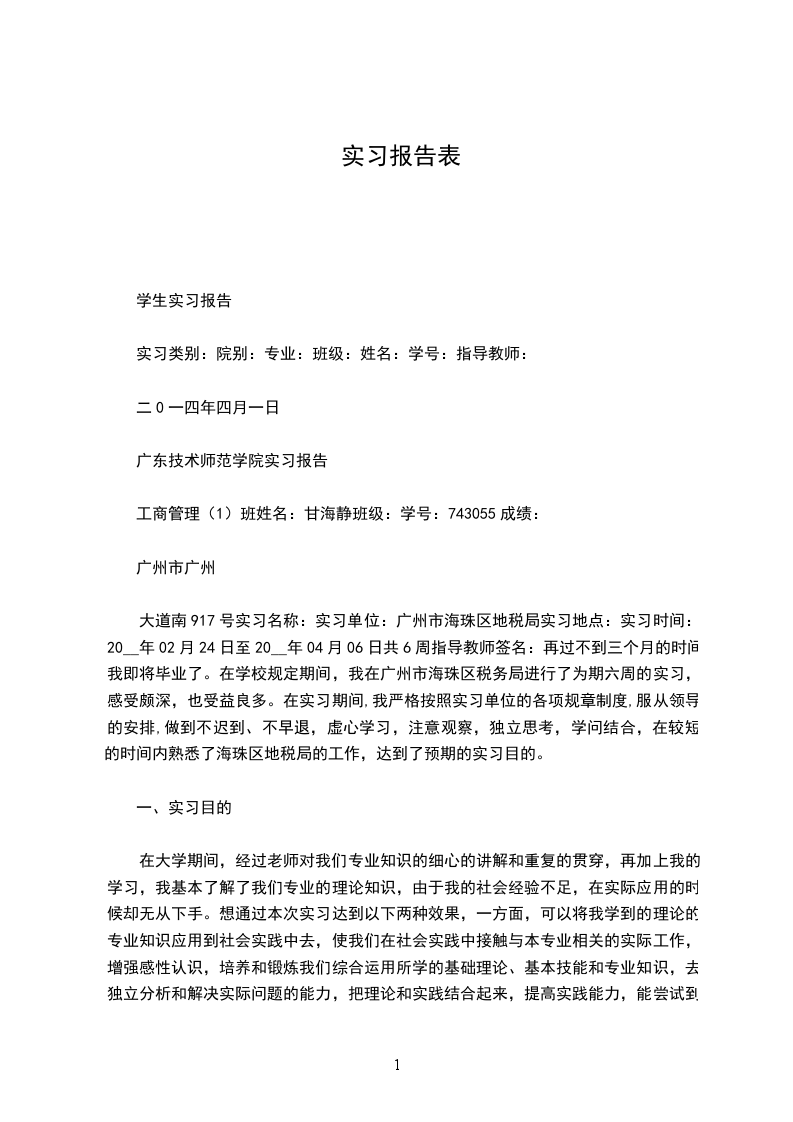 大道南917号实习名称:实习单位:广州市海珠区地税局实习地点:实习时间:20__年02月24日至20__年04月06日共6周指导教师签名:再过不到三个月的时间,我即将毕业了。在学校规定期间,我在广州市海珠区税务局进行了为期六周的实习,感受颇深,也受益良多。在实习期间,我严格按照实习单位的各项规章制度,服从领导的安排,做到不迟到、不早退,虚心学习,注意观察,独立思考,学问结合,在较短的时间内熟悉了海珠区地税局的工作,达到了预期的实习目的。